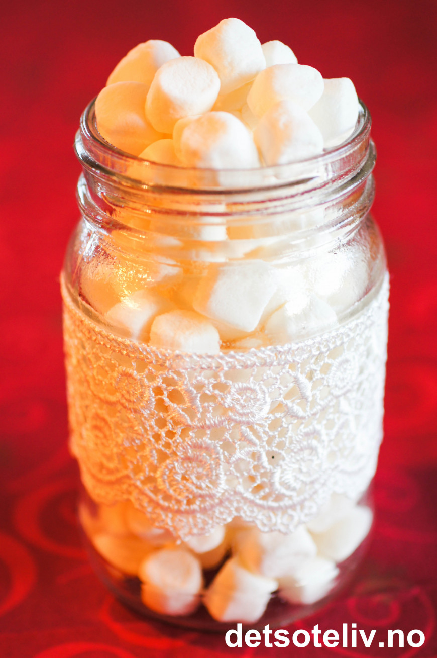 Mini-marshmallows passer best å ha i koppen. Du kan bruke store marshmallows også, eller du kan klippe store marshmallows opp i mindre biter.