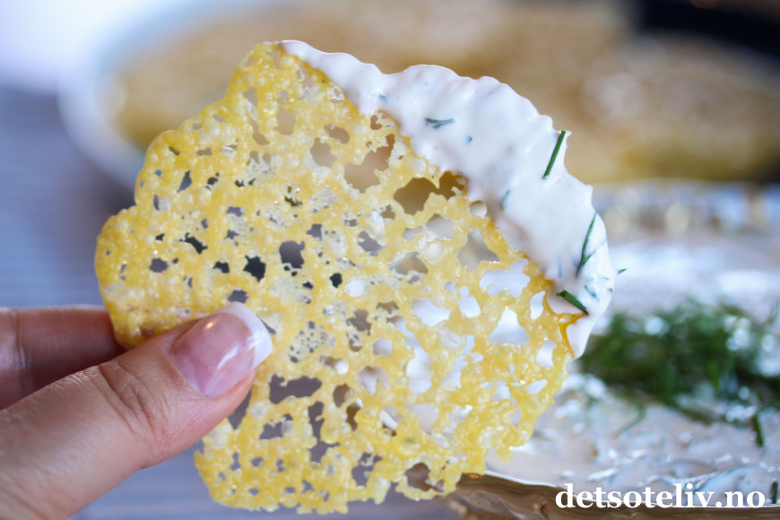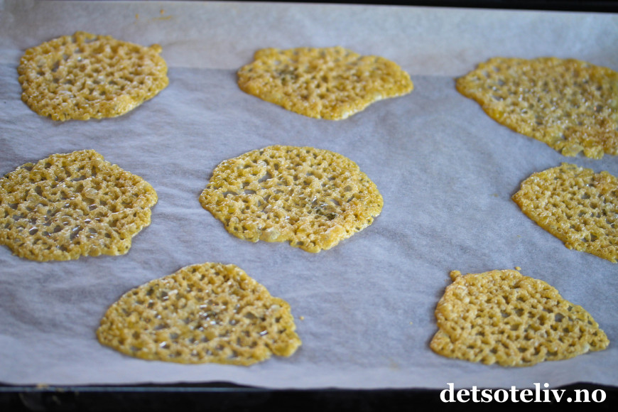 ♥ Merk at ostechipsene må stå og avkjøles på platen slik at de stivner før du flytter på dem. Ostechipsene er temmelig skjøre, så du må være forsiktig når du tar i dem.