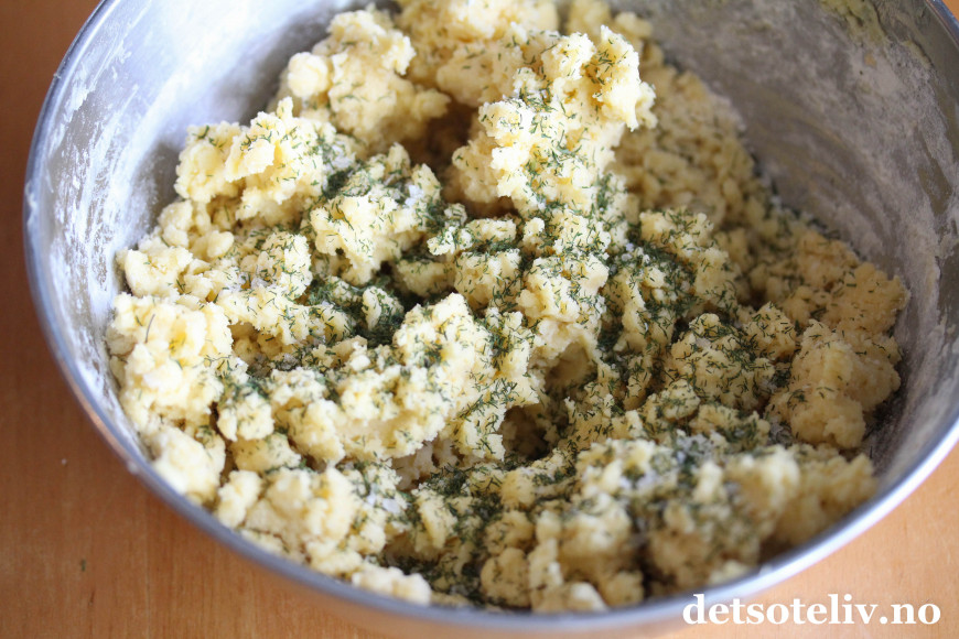 Ha revet ost, mykt smør, mel og egg i en bolle. Elt ingrediensene raskt sammen (jeg brukte en håndmikser med eltekroker til dette). Tilsett dill og maldonsalt og kna dette raskt inn i deigen.