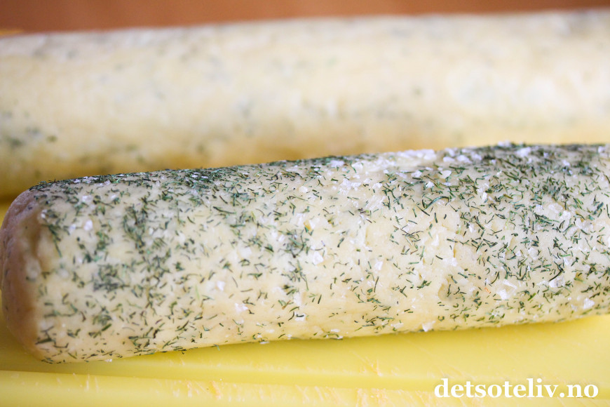 Ha dill og salt på bakebordet og rull deigrullene i dette slik at kantene blir dekket av dill og litt salt.