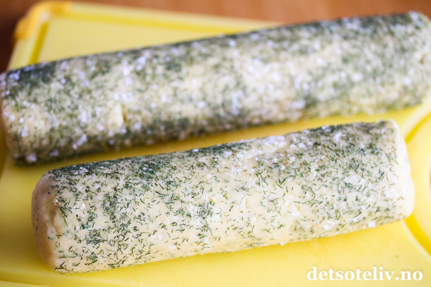 Ha dill og salt på bakebordet og rull deigrullene i dette slik at kantene blir dekket av dill og litt salt. Sett rullene i fryseren i 10-20 minutter så de blir fastere.