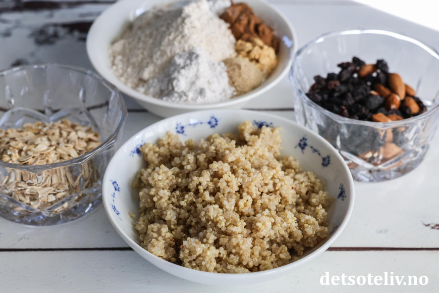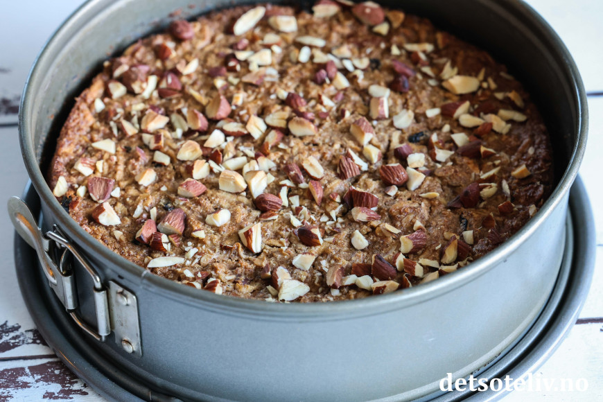 Dette er en saftig, sunn og god kake med revet eple og kokt quinoa, i tillegg til havre, mandler, rosiner og krydder.