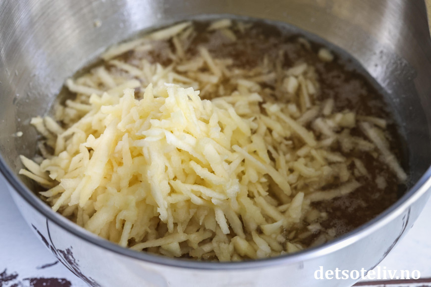 Ha lønnesirup, rapsolje, eplecidereddik og vaniljeekstrakt i en bolle. Skrell og rens eplene, riv dem grovt og tilsett.