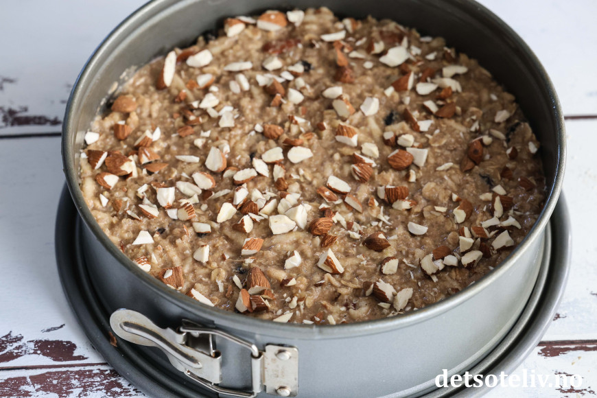 Ha deigen i en rund form (24 cm i diameter) med bakepapir i bunnen. Dryss over grovt hakkede mandler.