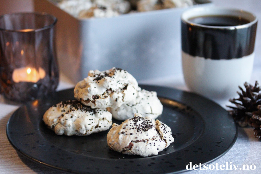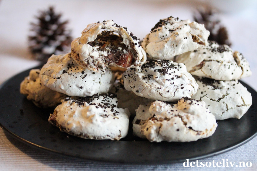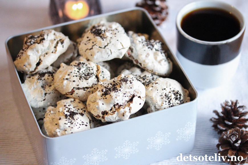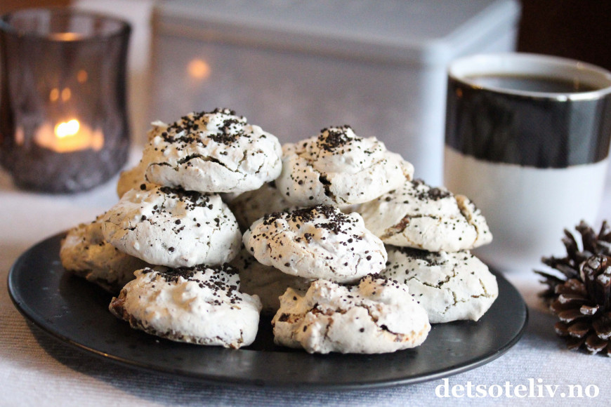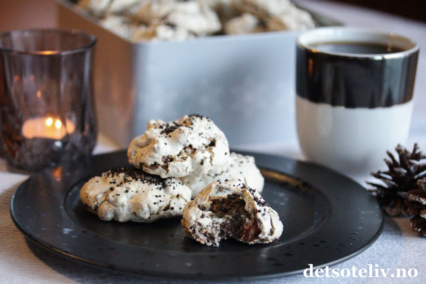 Blant de mest populære oppskriftene på Det søte liv før jul er Vepsebol, som er luftige marengskaker med hakkede mandler og sjokolade. Jeg fikk tips om å blande inn lakris i marengsrøren før steking, og det var jammen meg et godt tips!