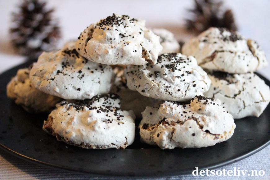 Sett små topper ved hjelp av to teskjeer på stekeplater dekket med bakepapir. Dryss over litt rålakrispulver til pynt.
