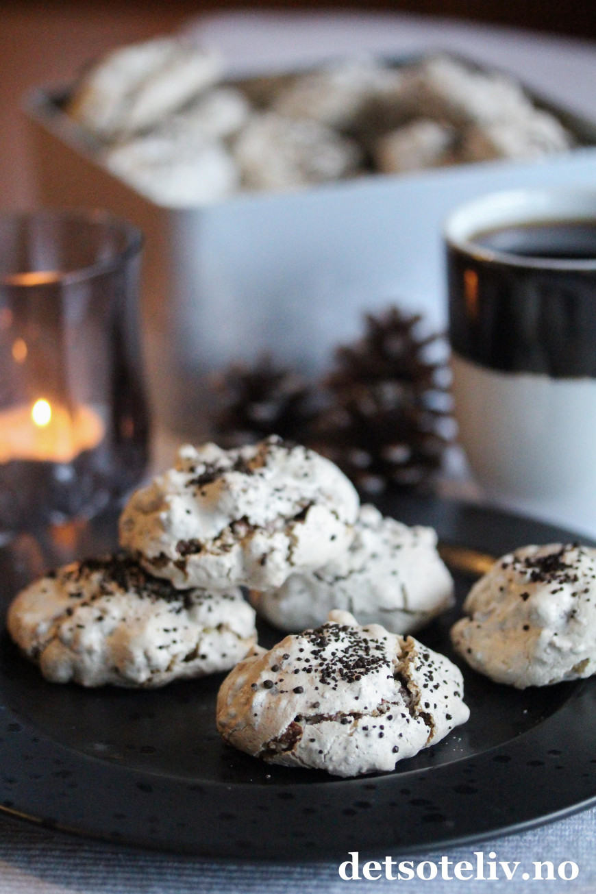 ♥ Det er viktig at mandler, sjokolade og lakrispulveret vendes helt forsiktig inn i marengsen. Bruker du mikseren til dette, vil marengsen kunne klappe sammen og bli tynn i konsistensen, og da vil kakene bli helt flate. Marengsen skal beholde sin tykke konsistens også etter at du har blandet i mandler, sjokolade og lakris.
