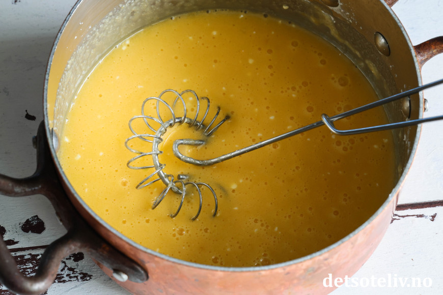 Ha den varme vaniljefløten litt og litt i eggeblandingen. Bland godt med håndvispen. Ha så det hele tilbake i kjelen.