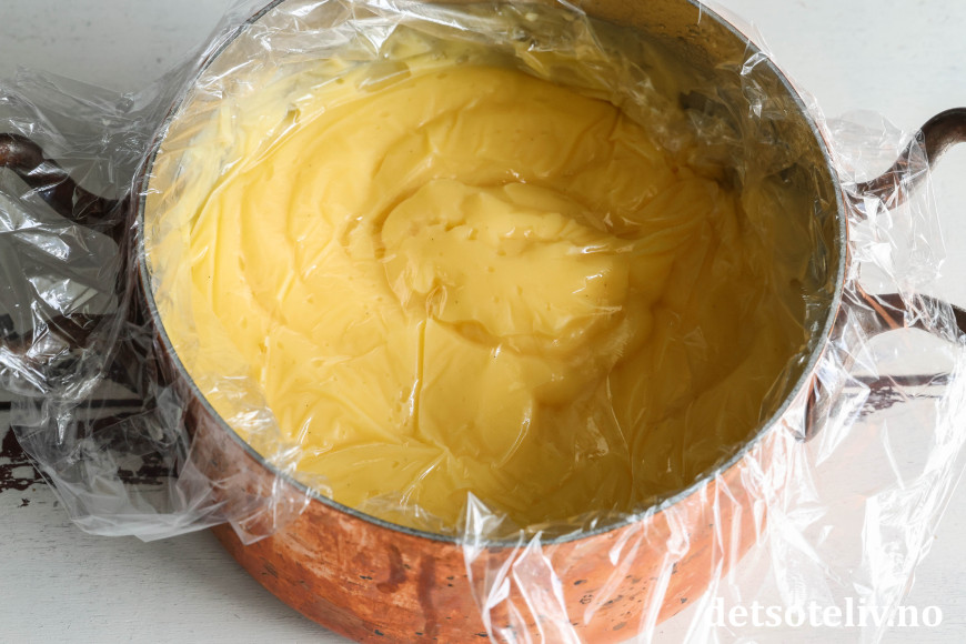 Sett så vaniljekremen i kjøleskapet til den er helt tykk (gjerne over natten, men dekk da gjerne over med litt plastfilm så det ikke danner seg snerk på overflaten).