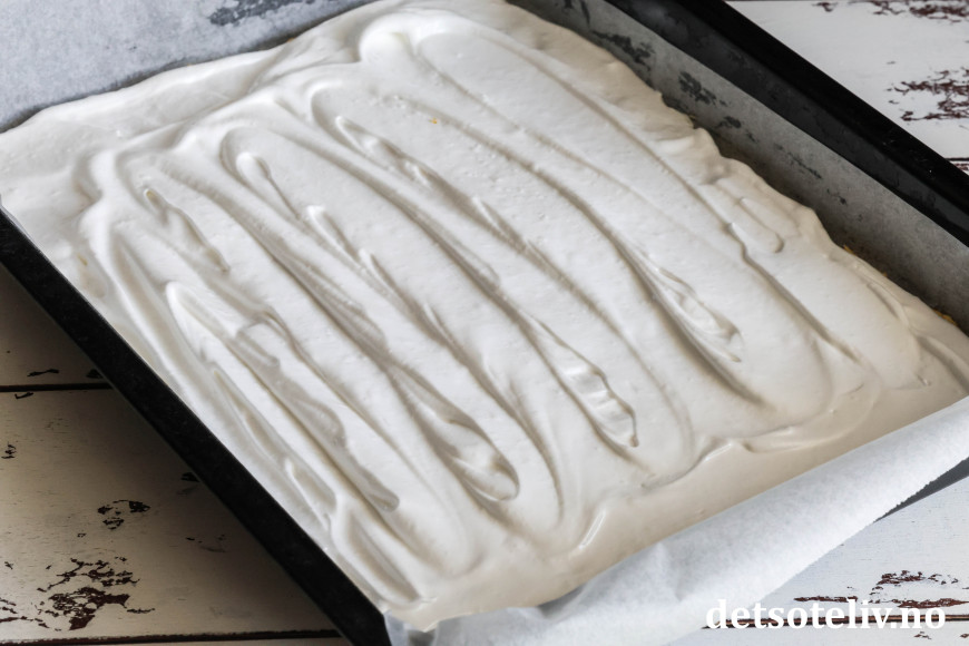 Ikke åpne opp ovnsdøra på vidt gap, når den er ferdig. Slå av ovnen og la døra stå med 5-10cm åpning i ca 10min, før du tar kaka ut, da faller ikke marengsen i sammen