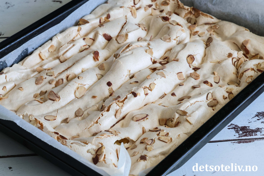 Fordel marengsen jevnt over deigen i langpannen. Strø over mandelflak.