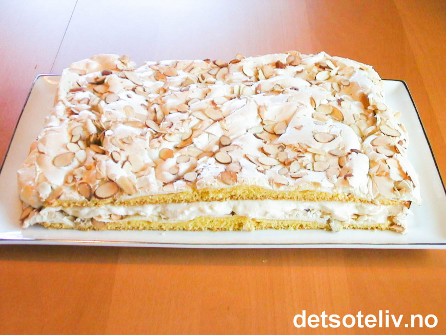 Jeg måtte starte helt på nytt, men en annen oppskrift jeg ikke fant her. Og da ble kaken høy og flott, og ingen antydning til svidd bunn som er rå inni. Marengsen ble sprø og florlett, og mandlene ble ikke svidd. Akkurat slik en kvæfjordkake skal være.