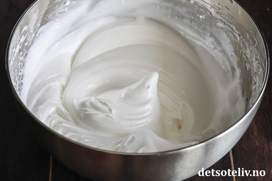 Visp eggehvitene stive. Tilsett sukkeret og pisk videre til stiv marengs.