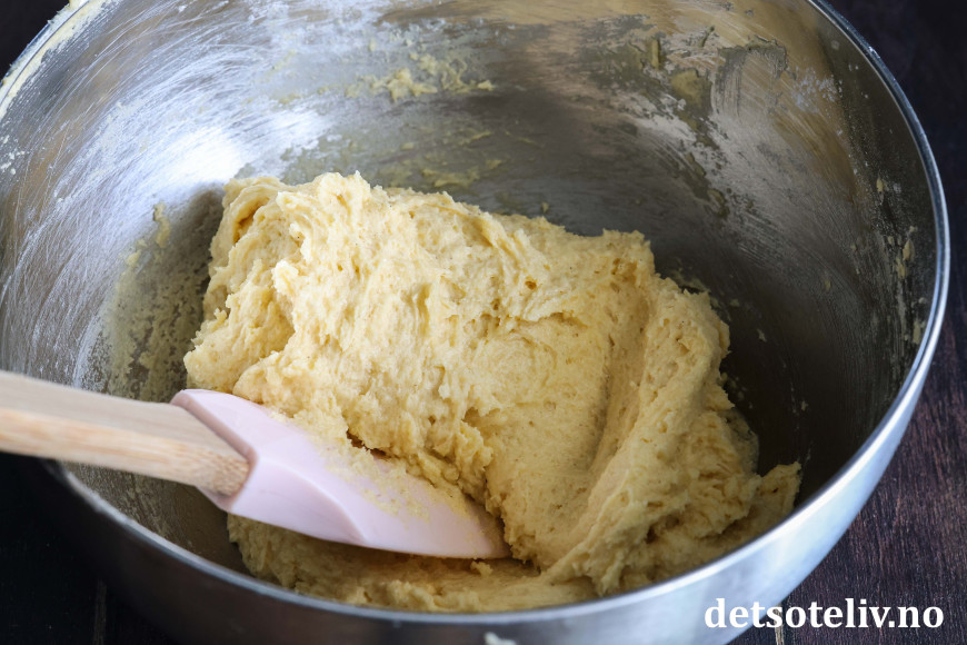 Pisk smør og sukker til smørkrem. Pisk inn eggeplommene. Sikt sammen det tørre. Bland det tørre og melken i smørkremen så du får en jevn deig.