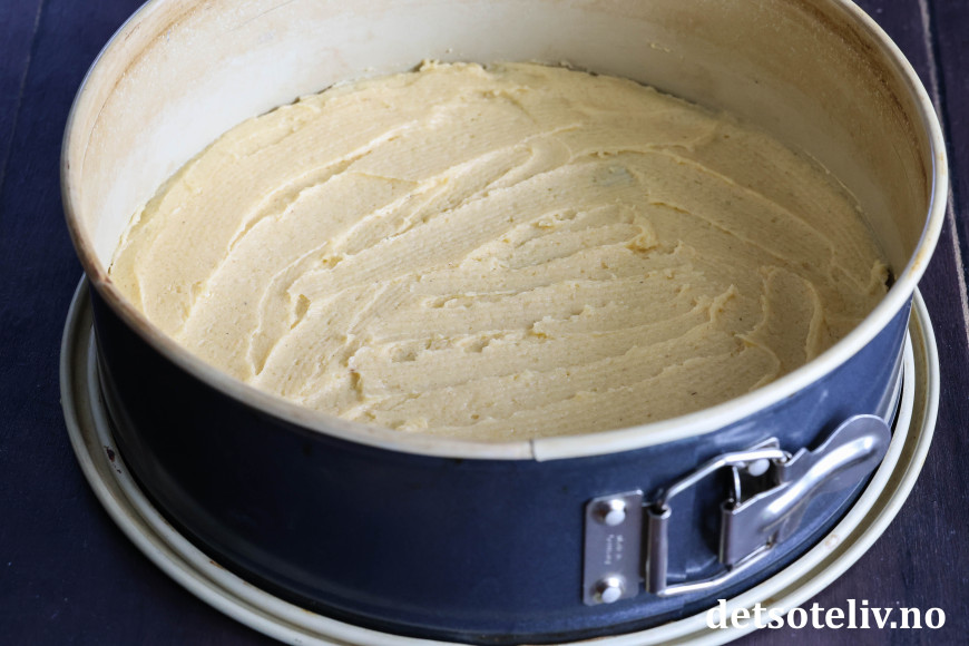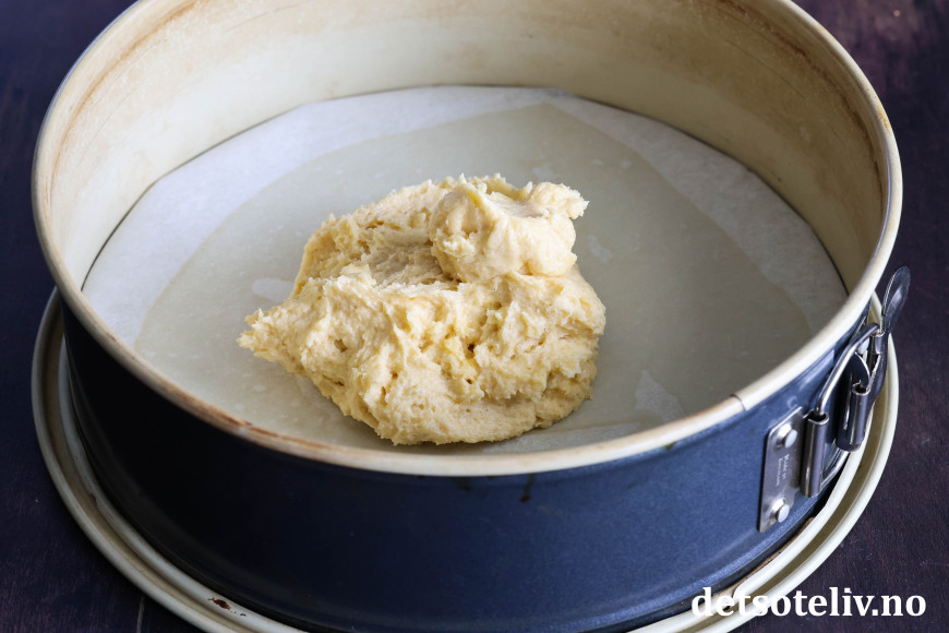 Ha bakepapir i bunnen på 2 runde kakeformer som er 24 cm i diameter (se tips). Smør deigen tynt utover i bunnen på formene.