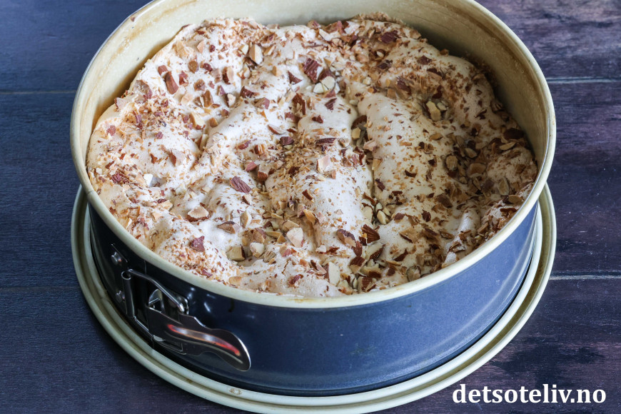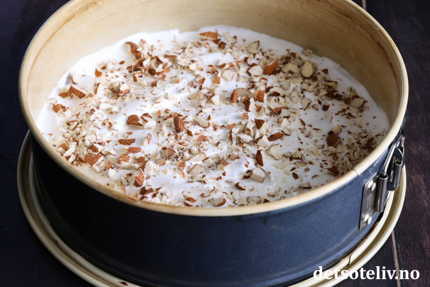 Fordel marengsen jevnt over deigen i de to formene. Strø hakkede mandler over den ene av bunnene.