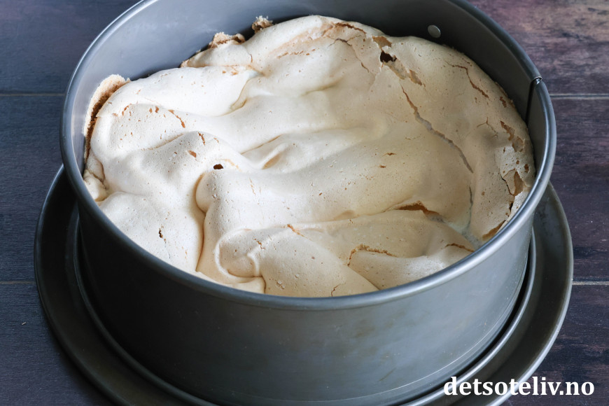 ♥ Merk at det kommer til å bli kun et veldig tynt lag med kakedeig i hver av formene. Bruk en smørekniv og gjør deg litt flid med å prøve å få deigen utover i et tynt og jevnt lag. Det er meningen at deiglaget skal være tynt, og kaken kommer til å bli høy nok med to lag, marengs og fyll. 😊