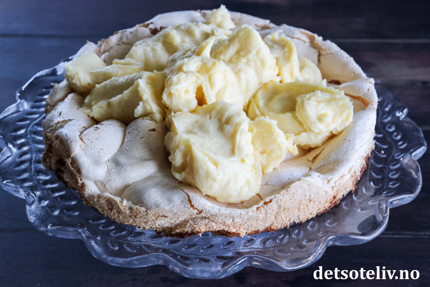 ♥ Jeg foretrekker å bruke hjemmelaget vaniljekrem, men det går også helt greit å bruke 5 dl ferdigkjøpt vaniljekrem. Rør i så fall minst mulig i vaniljekremen for å hindre at den blir for tynn i konsistensen.