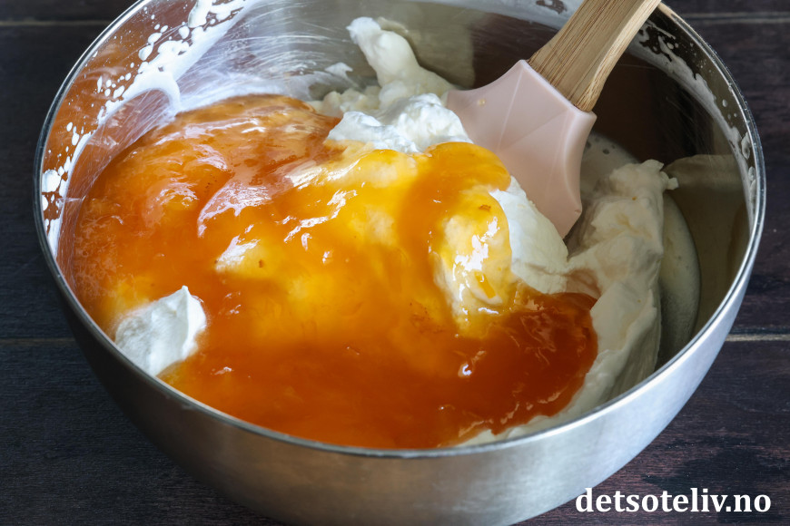 Pisk kremfløten til krem. Vend inn aprikossyltetøy.