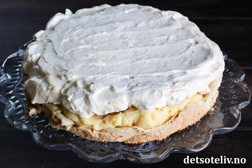 Legg den ene kakebunnen (uten mandler) på et passende fat (jeg foretrekker at marengsen vender oppover).