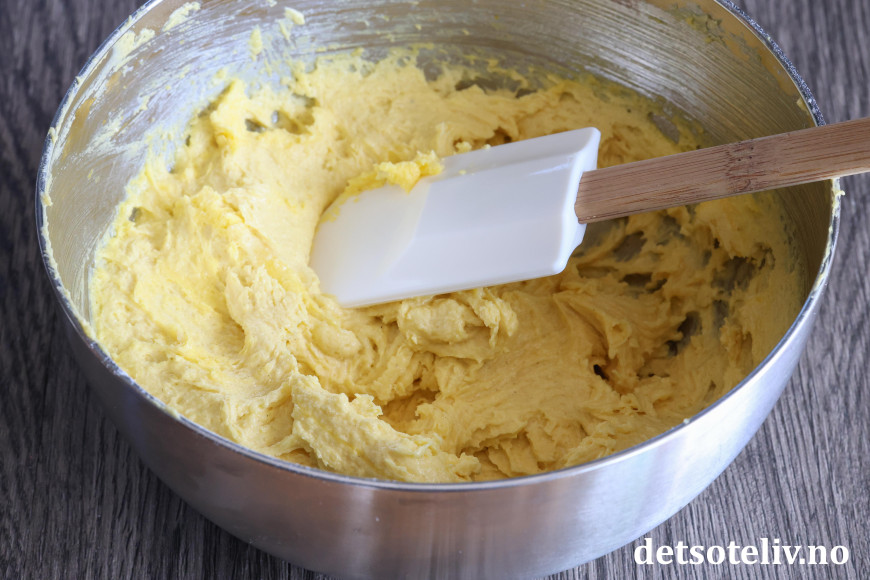 Pisk smør og sukker til smørkrem. Pisk inn eggeplommene. Sikt sammen det tørre. Bland det tørre og melken i smørkremen så du får en jevn deig.