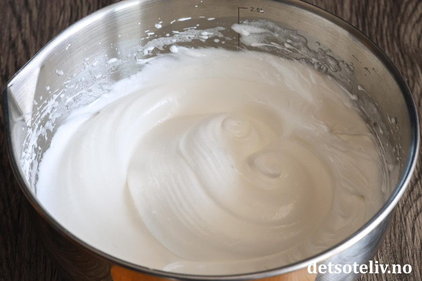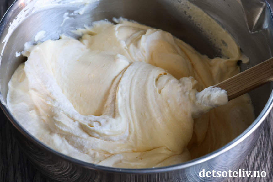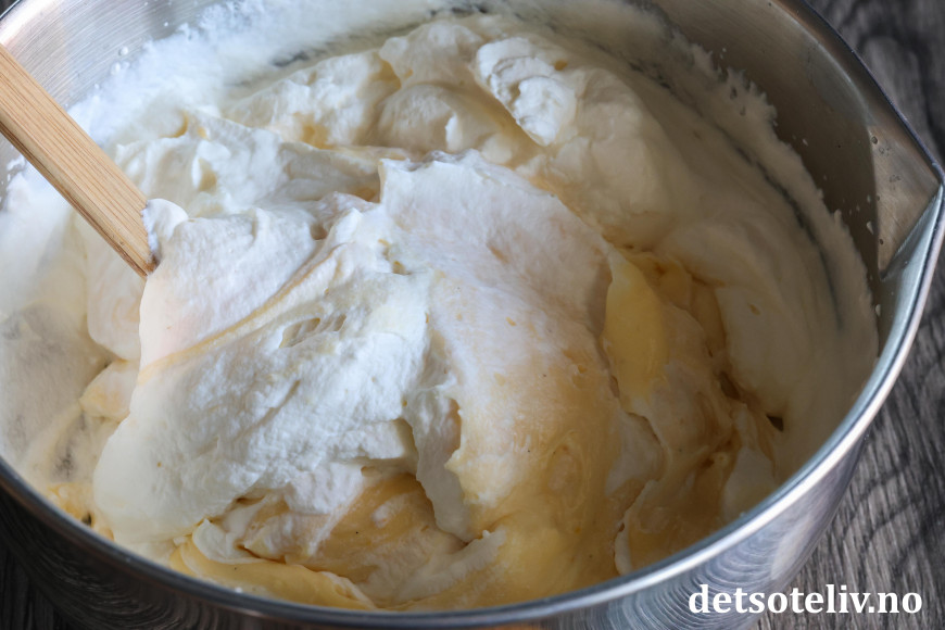 ♥ Når du lager fyllet må du blande kremen og vaniljekremen helt forsiktig. Jeg anbefaler å bruke en slikkepott og bare så vidt røre fyllet sammen. Det gjør ikke noe hvis fyllet er litt marmorert. Det er min erfaring at fyllet blir altfor tyntflytende hvis du rører for mye.