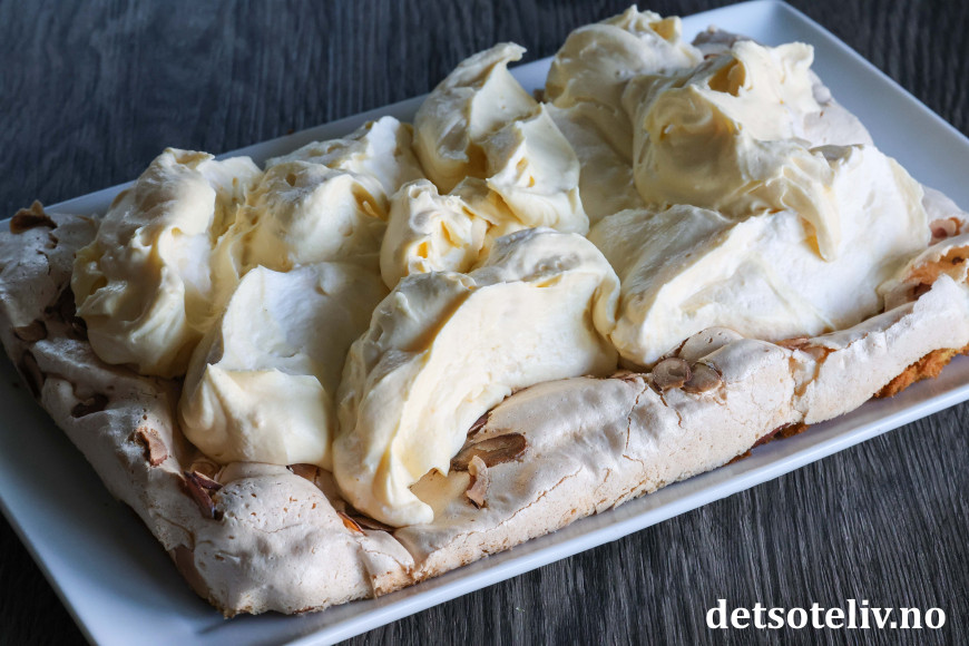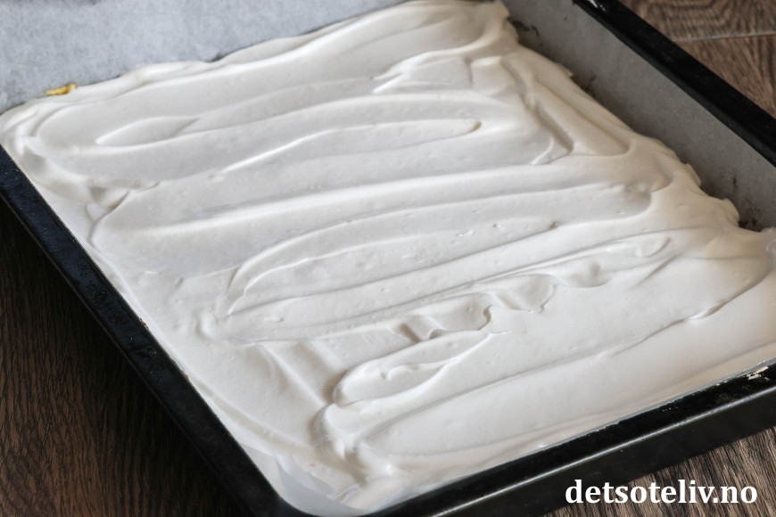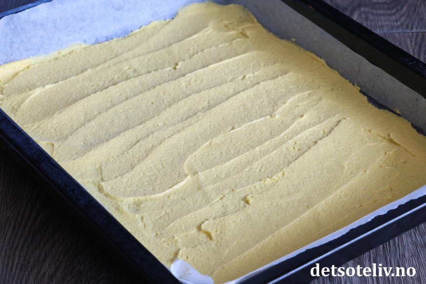 ♥ Merk at det kommer til å bli kun et veldig tynt lag med kakedeig i langpannen. Bruk en smørekniv og gjør deg litt flid med å prøve å få deigen utover i et tynt og jevnt lag. Det er meningen at deiglaget skal være tynt, og kaken kommer til å bli høy nok med to lag, marengs og fyll. 😊