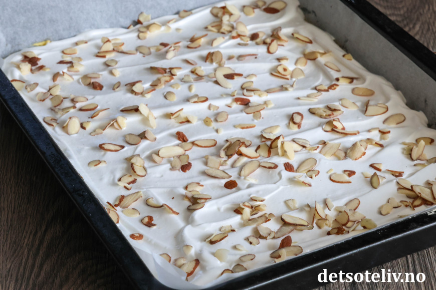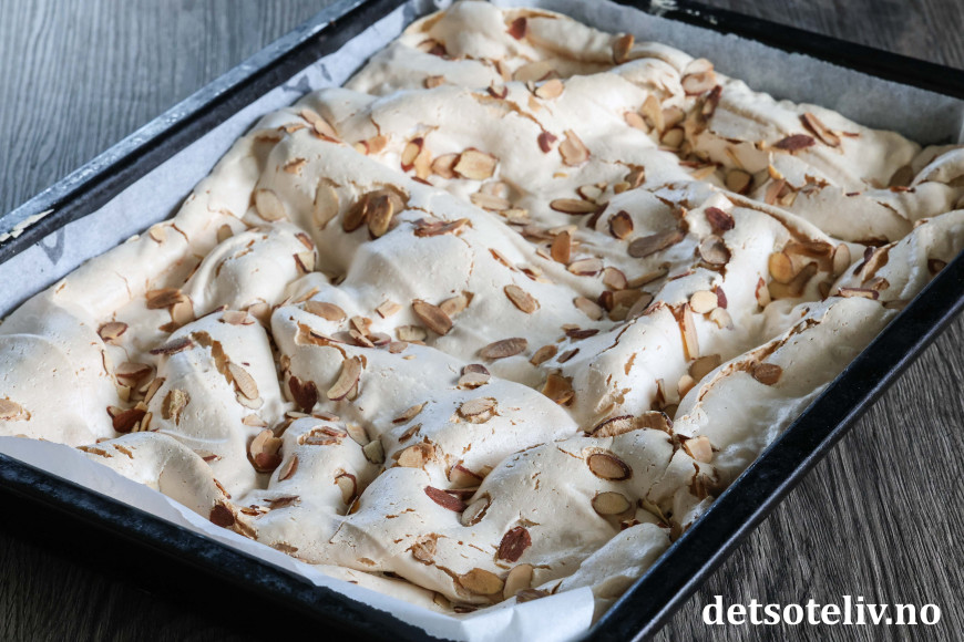 Visp eggehvitene stive. Tilsett sukkeret og pisk videre til stiv marengs. Fordel marengsen jevnt over deigen i langpannen. Strø over mandelflak.