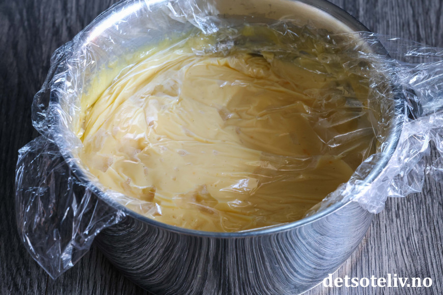 Sett så vaniljekremen i kjøleskapet til den er helt tykk (gjerne over natten, men dekk da gjerne over med litt plastfilm så det ikke danner seg snerk på overflaten).