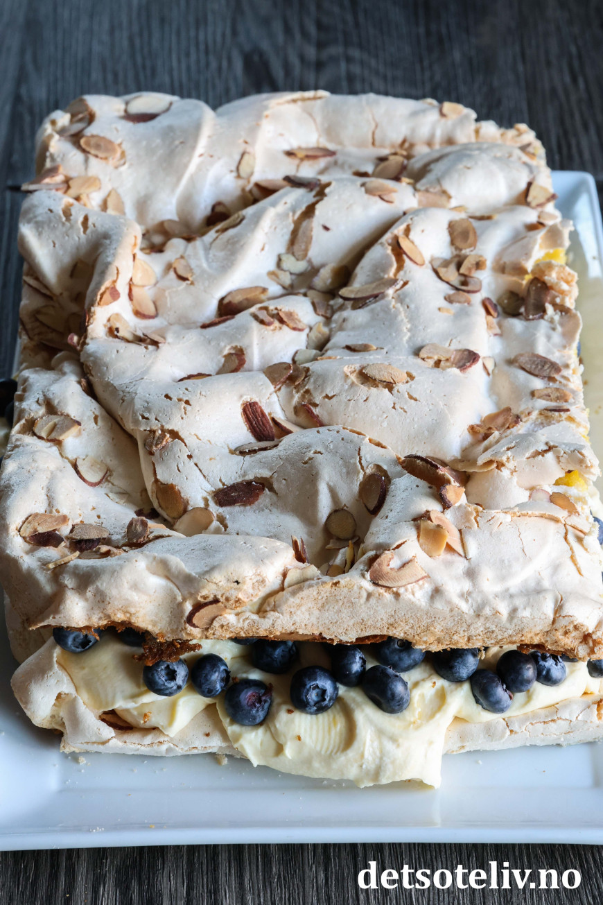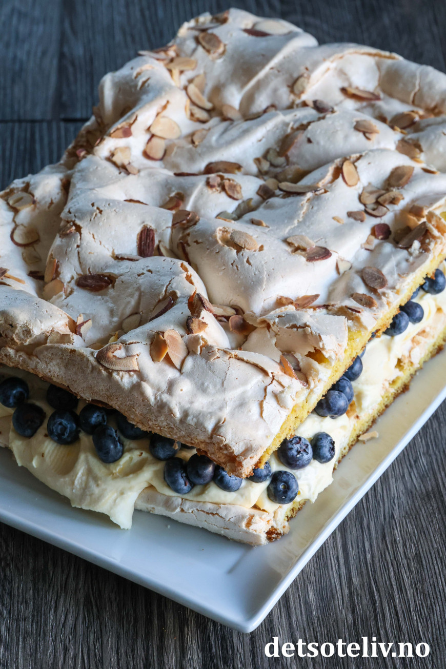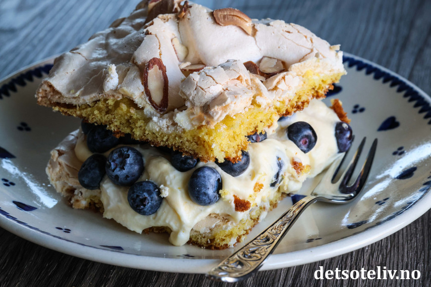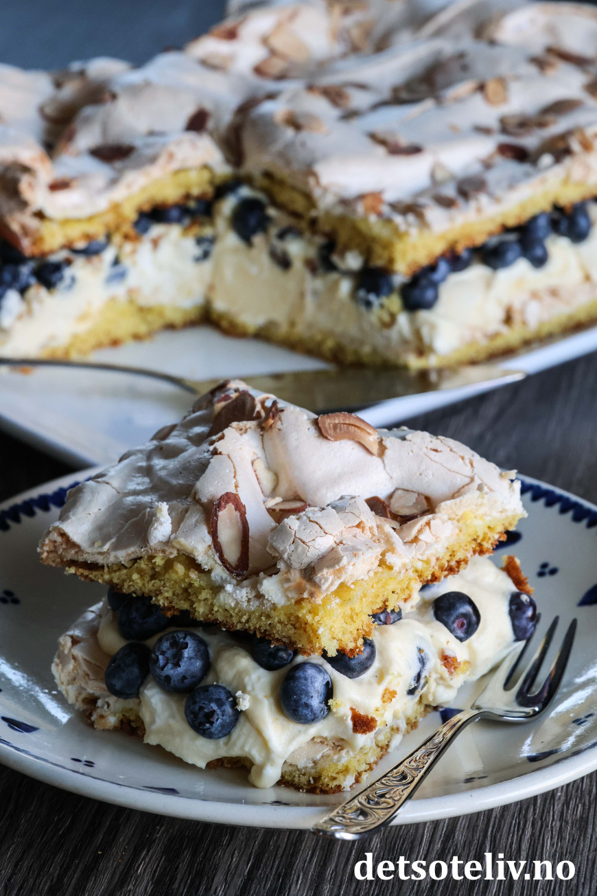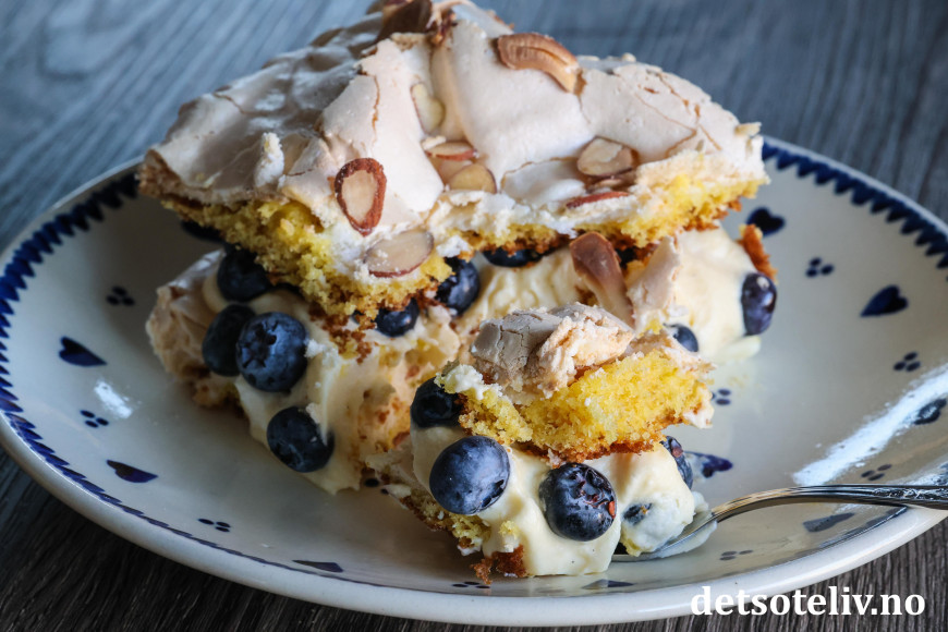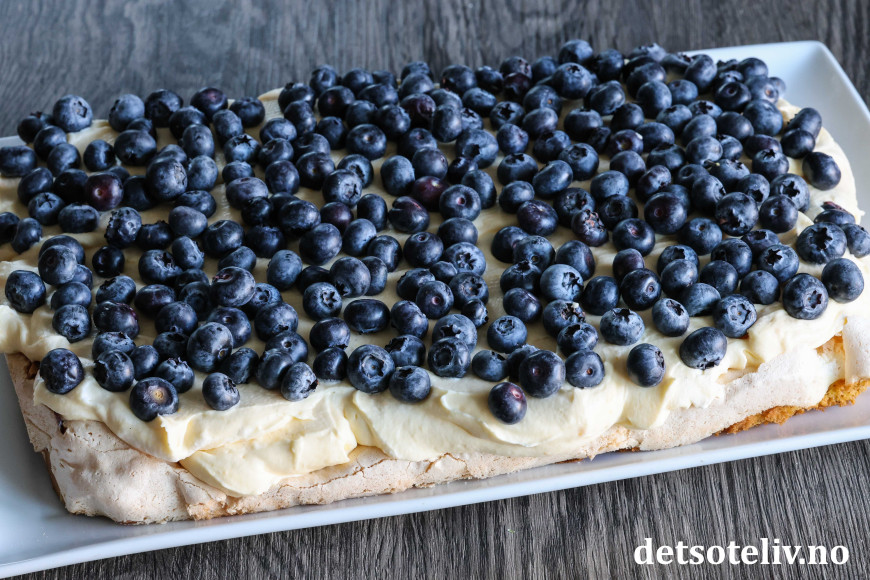 Fordel den luftige vaniljekremen over kaken i et tykt lag. Ha over masse blåbær.