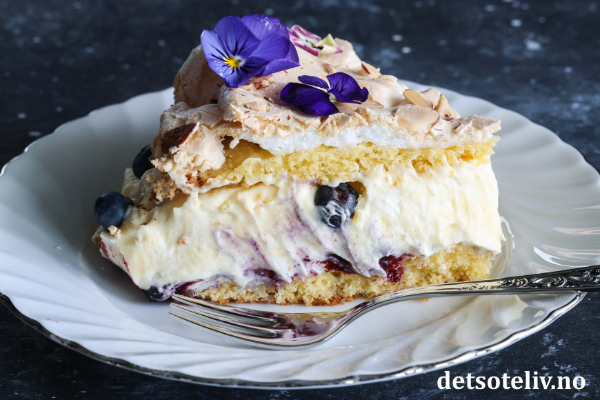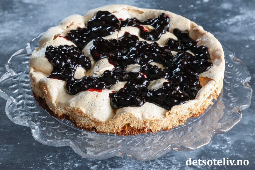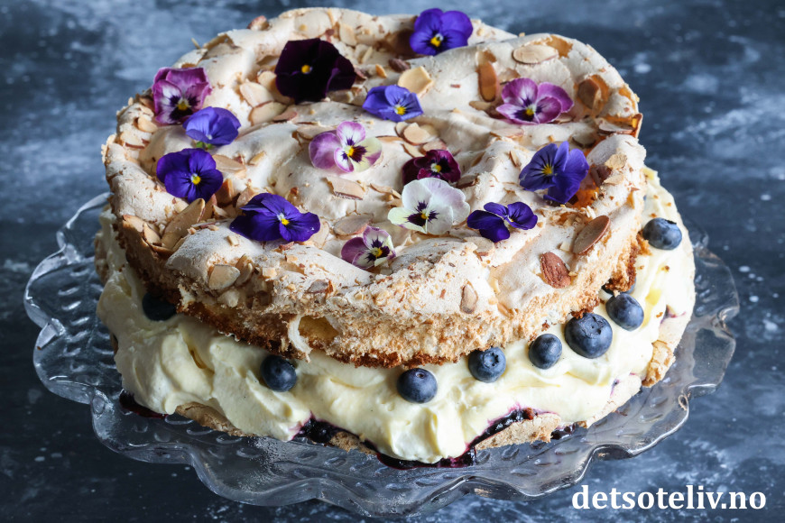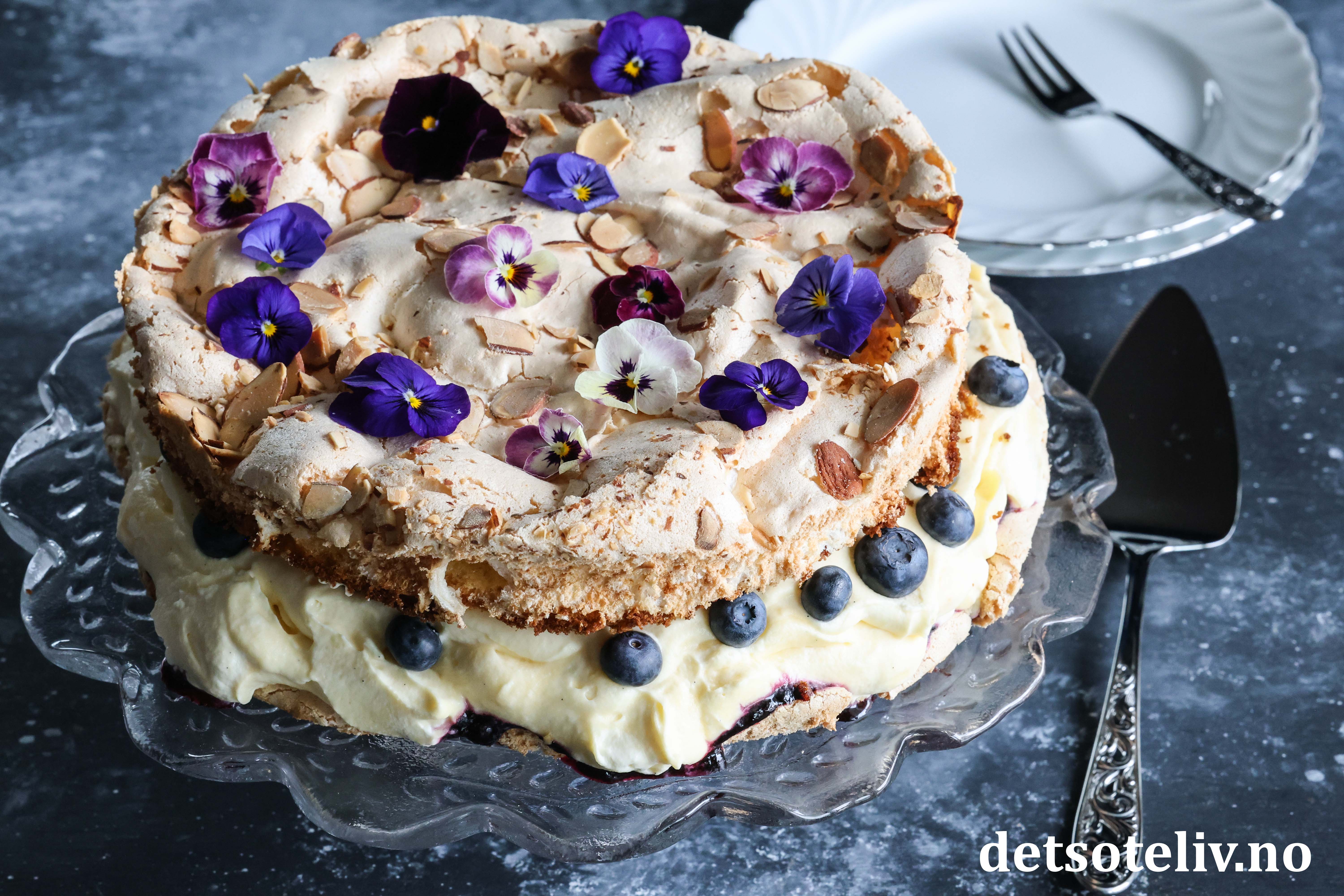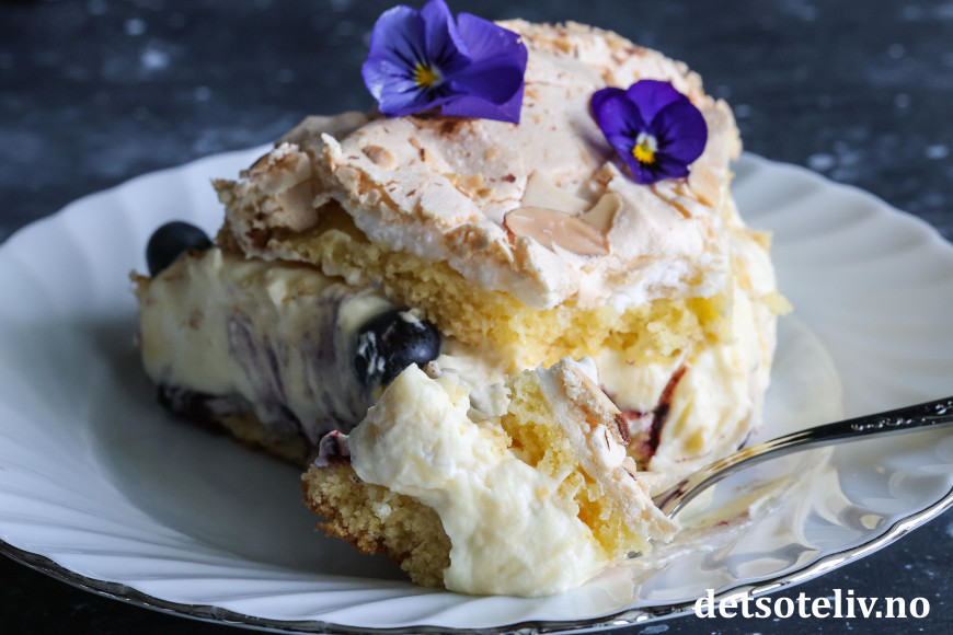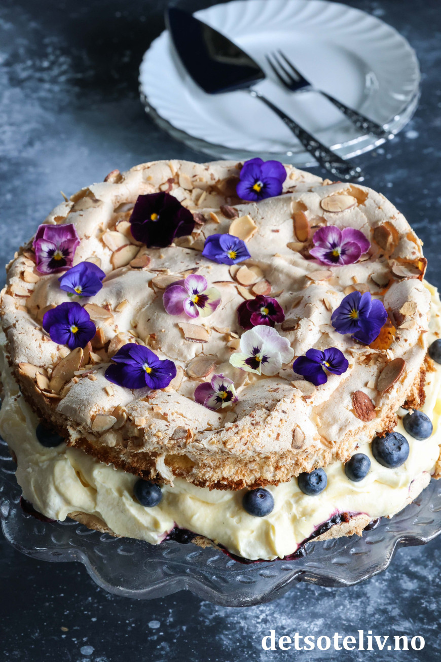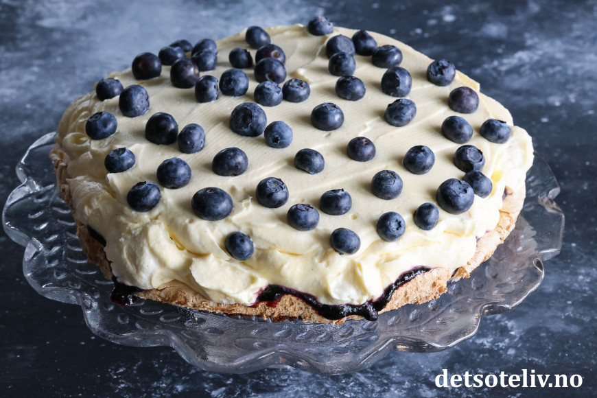 Jeg har tidligere laget Verdens Beste med blåbær. Her er en rund versjon av denne kaken, som jeg har fylt med blåbærsyltetøy og friske blåbær i tillegg til vaniljekrem.