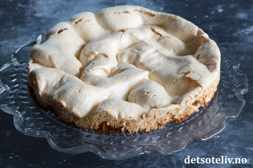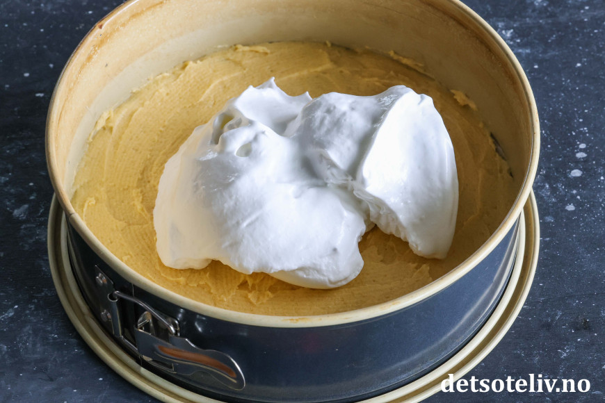 ♥ Merk at det kommer til å bli kun et veldig tynt lag med kakedeig i hver av formene. Bruk en smørekniv og gjør deg litt flid med å prøve å få deigen utover i et tynt og jevnt lag. Det er meningen at deiglaget skal være tynt, og kaken kommer til å bli høy nok med to lag, marengs og fyll. 😊