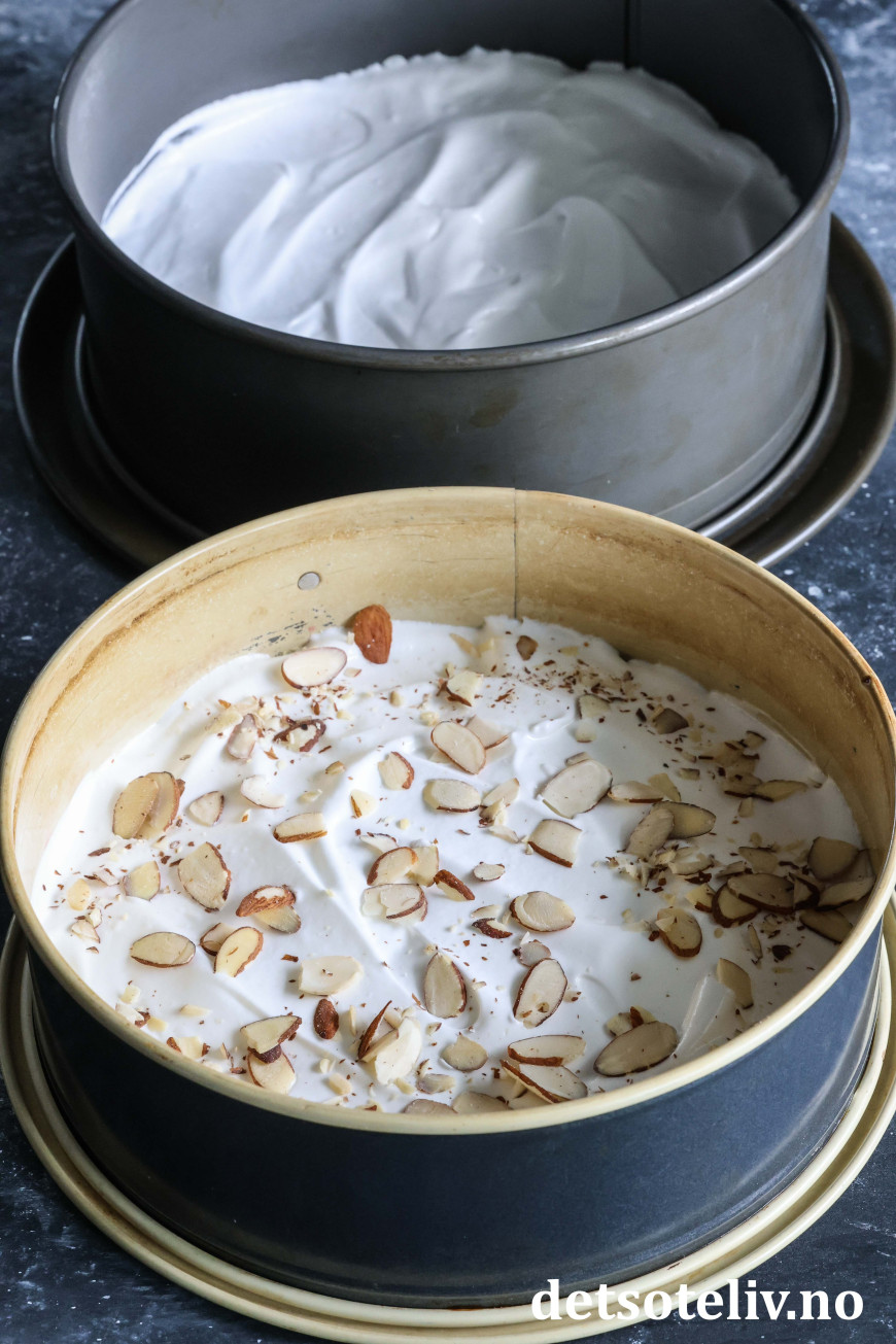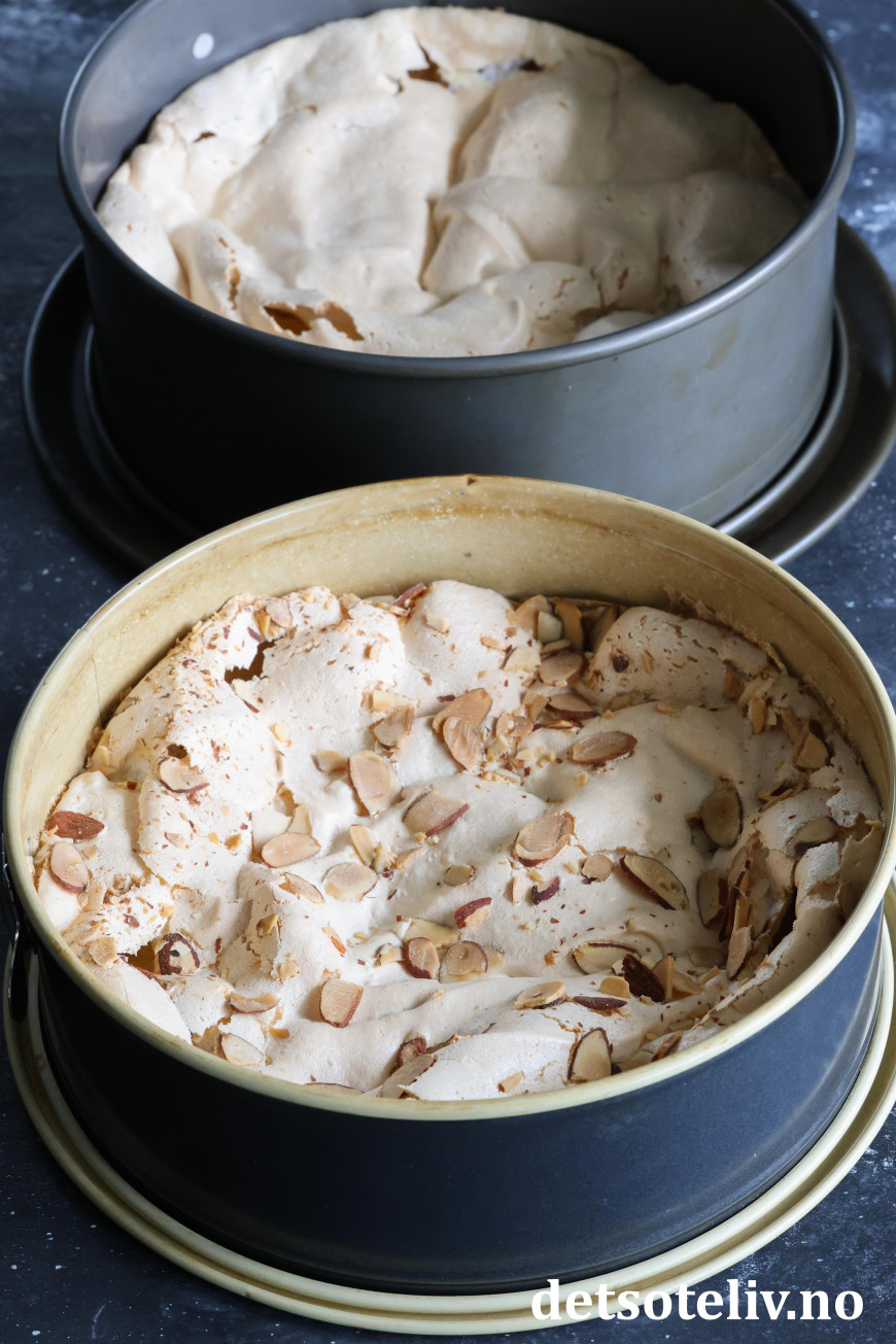 Fordel marengsen jevnt over deigen i de to formene. Strø mandelflak over den ene av bunnene.