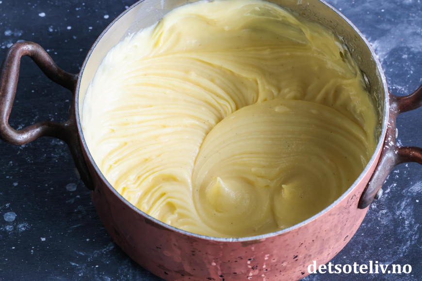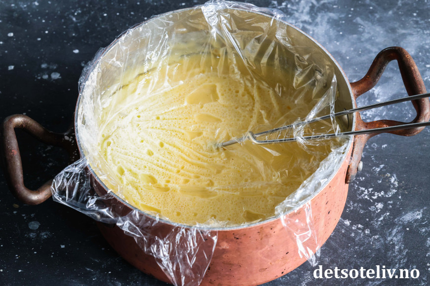 Sett så vaniljekremen i kjøleskapet til den er helt tykk (gjerne over natten, men dekk da gjerne over med litt plastfilm så det ikke danner seg snerk på overflaten).