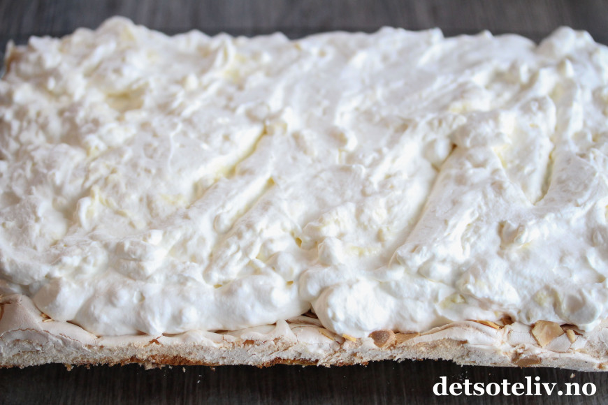 Pisk smør og sukker til smørkrem. Pisk inn eggeplommene. Sikt sammen det tørre og bland dette inn i deigen sammen med melken. Smør deigen tynt utover bunnen i en stor, bakepapirkledd langpanne (ca 30 x 40 cm).