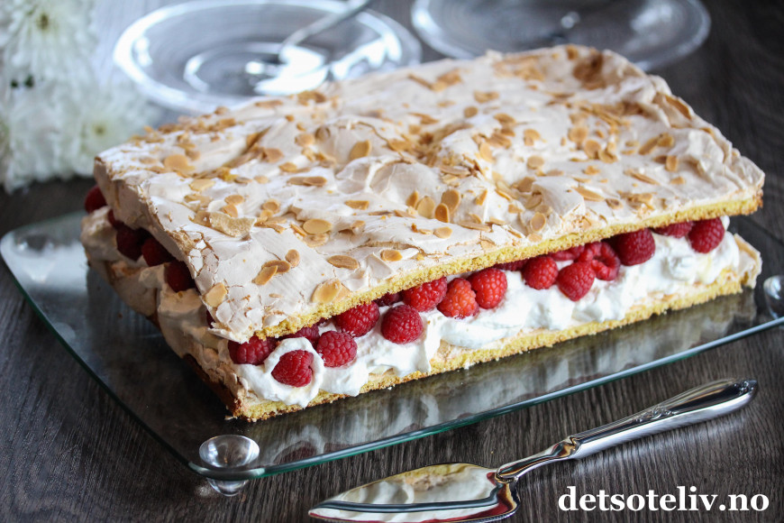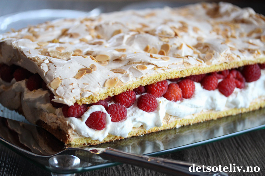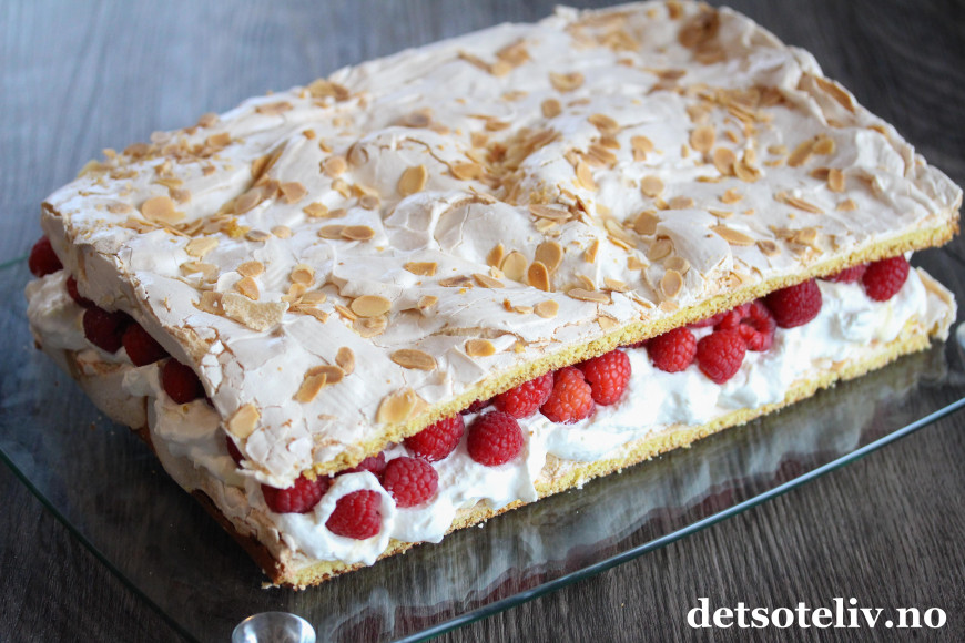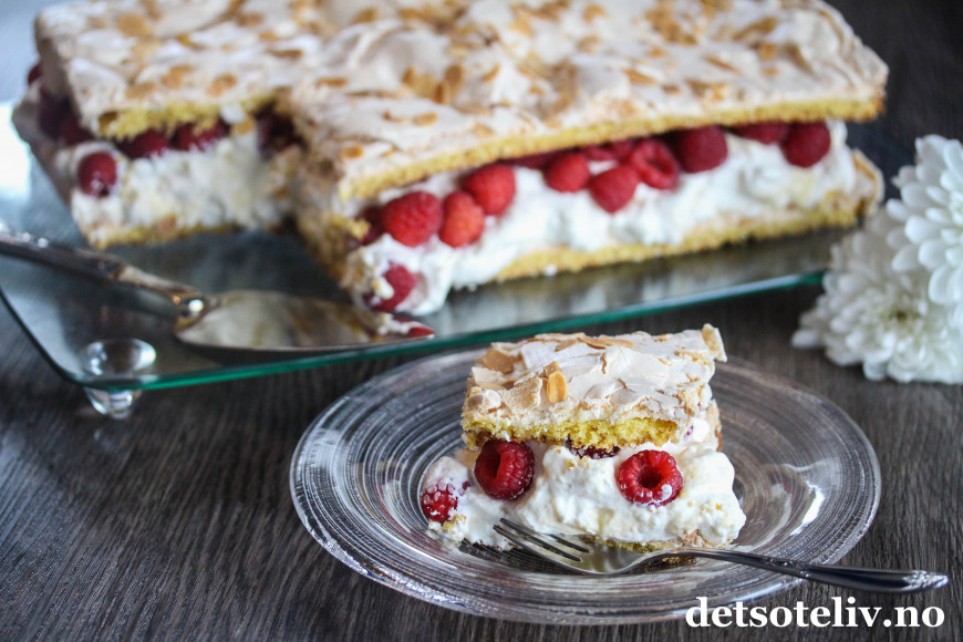 Men prøv en gang å fylle kaken med friske bringebær i tillegg til den smakfulle vaniljekremen, så vil du se hvor mye bedre kaken blir.