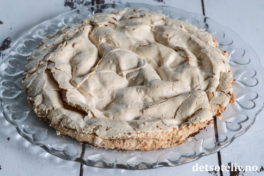Legg den ene kakebunnen (uten mandelflak) på et passende fat (jeg foretrekker at marengsen vender oppover).