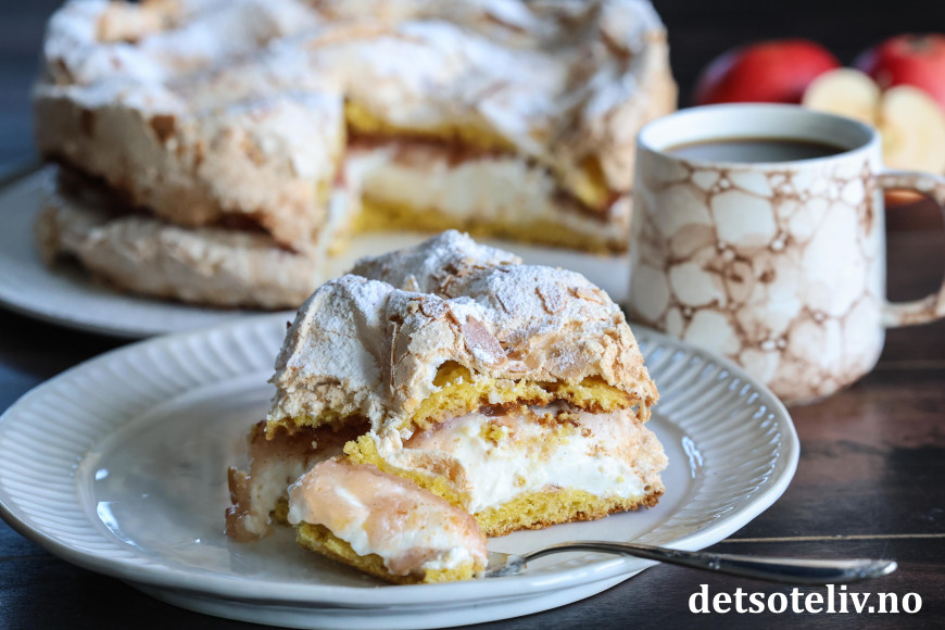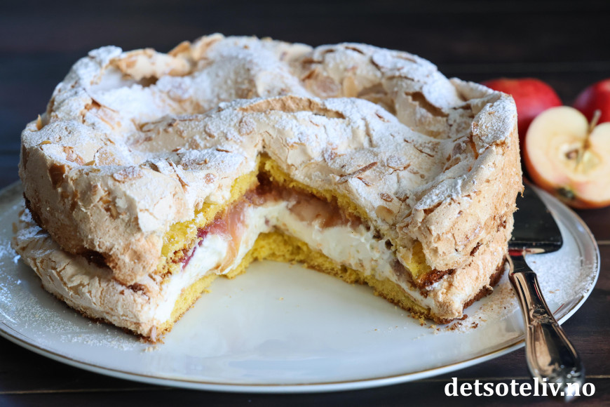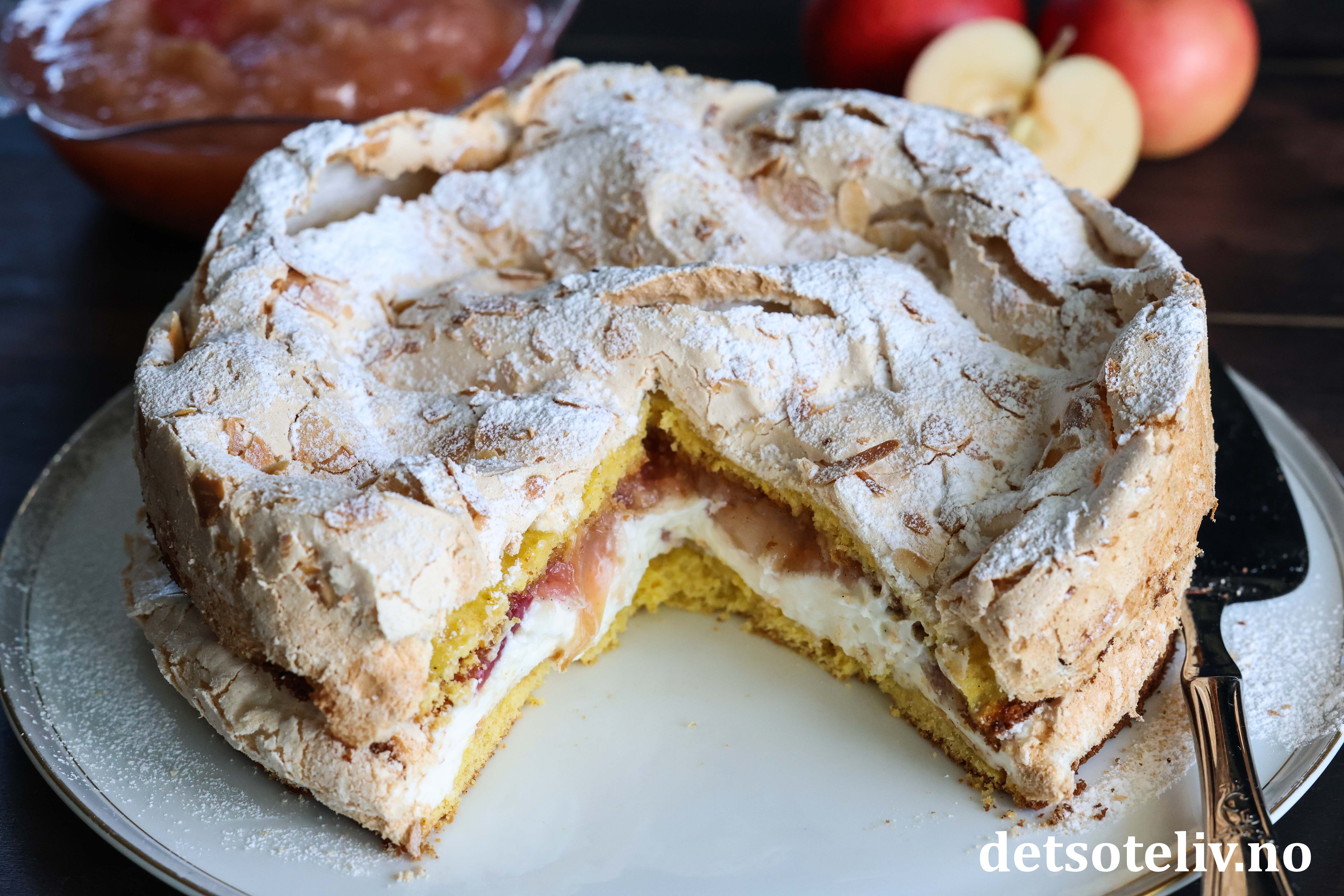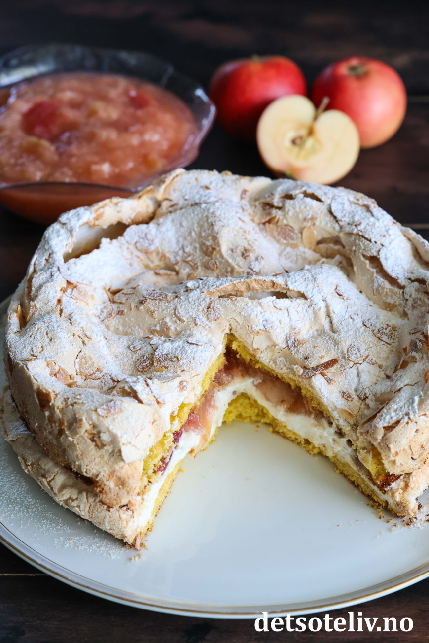 Her som rund kake fylt med mascarponekrem og hjemmelaget Eplekompott med vanilje og kanel.