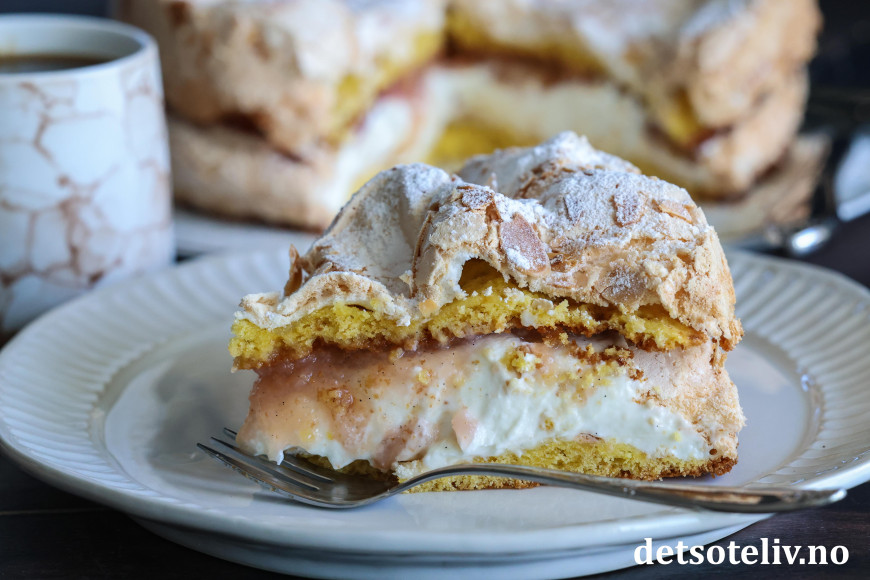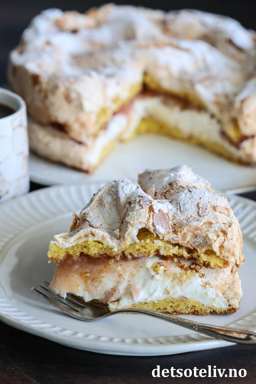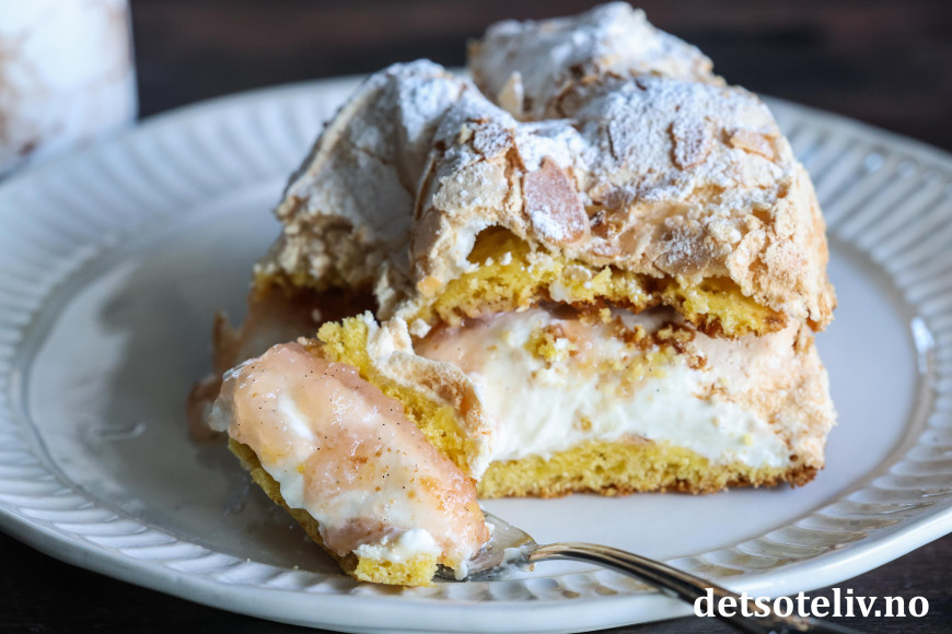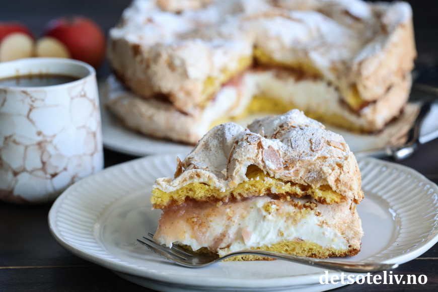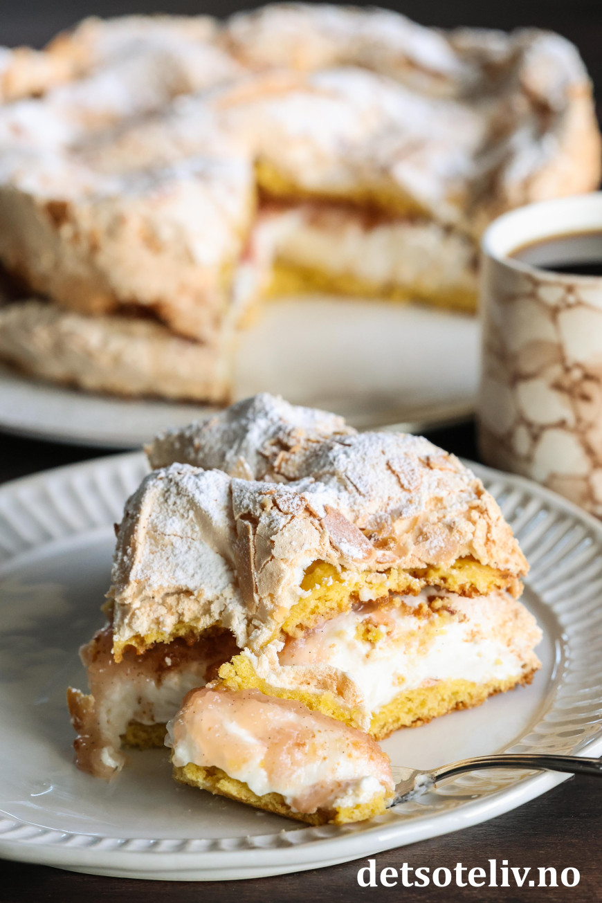 Her som rund kake fylt med mascarponekrem og hjemmelaget Eplekompott med vanilje og kanel.