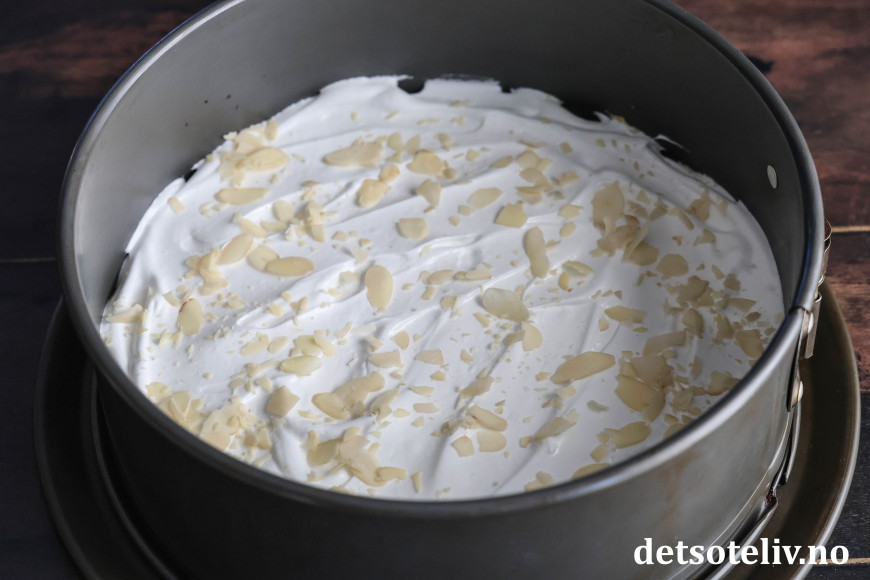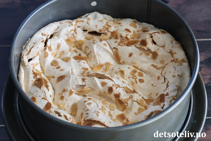Fordel marengsen jevnt over deigen i de to formene. Strø mandelflak over marengsen.