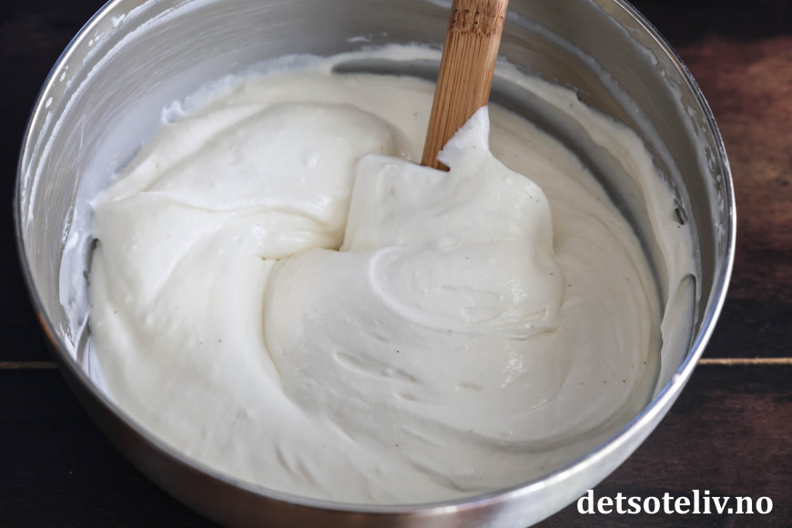 Merk at mascarponekremen kan være litt tynn i konsistensen når den er pisket sammen, men den tykner av å stå i kjøleskapet i noen timer, og er da klar til å brukes som fyll i kaken.