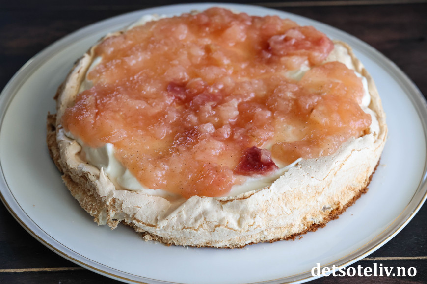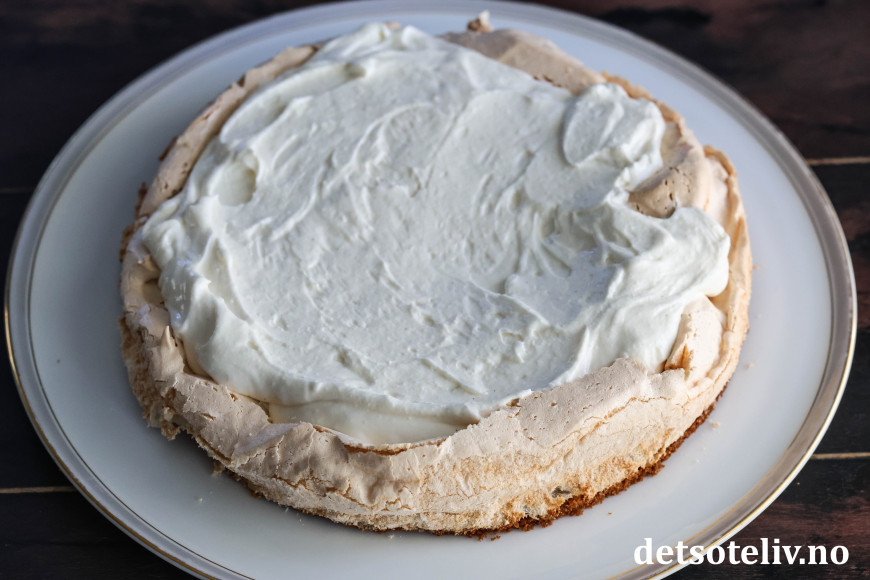 Legg den ene kakebunnen på et passende fat (jeg foretrekker at marengsen vender oppover). Ha over mascarponekremen i et tykt lag.