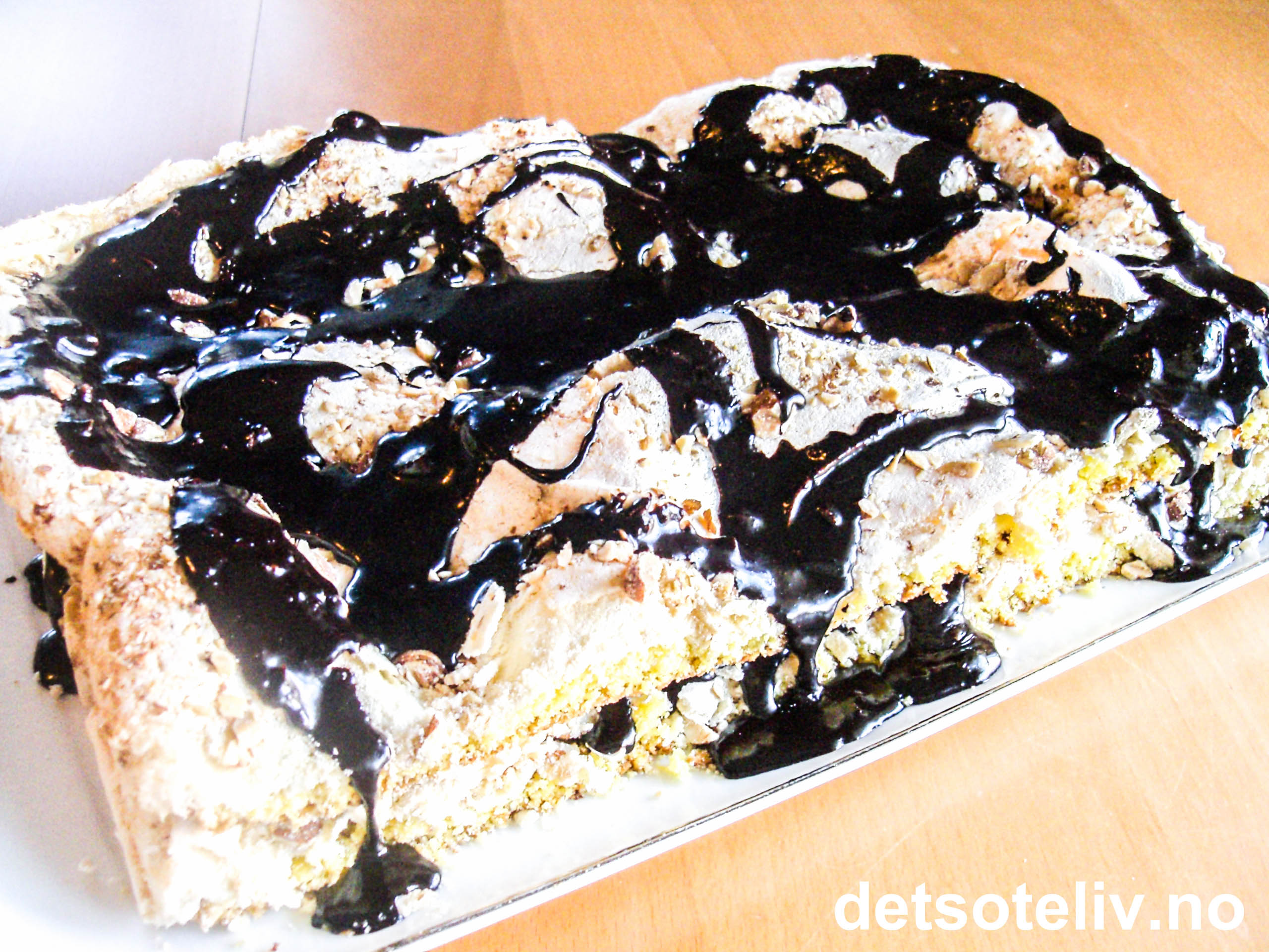 Kaken må stå kjølig frem til servering. Den holder seg god i kjøleskapet et par dager.