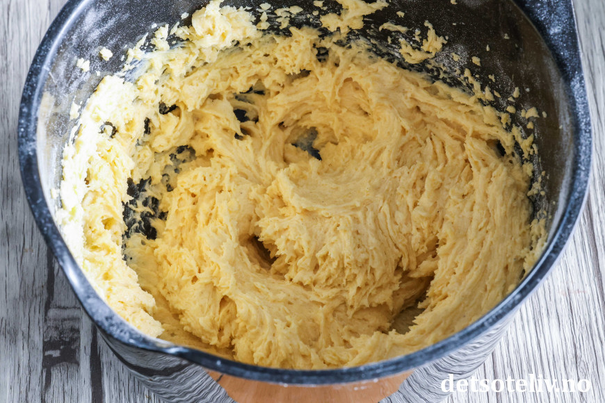 Pisk smør og sukker til smørkrem. Pisk inn eggeplommene. Sikt sammen det tørre. Bland det tørre og melken i smørkremen så du får en jevn deig.