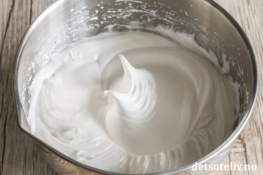 Visp eggehvitene stive. Tilsett sukkeret og pisk videre til stiv marengs.
