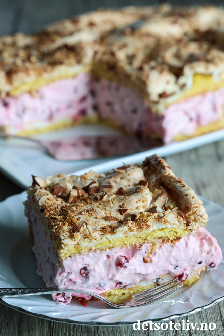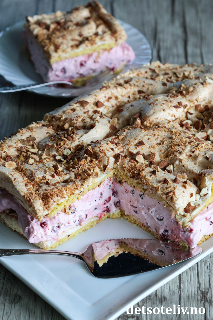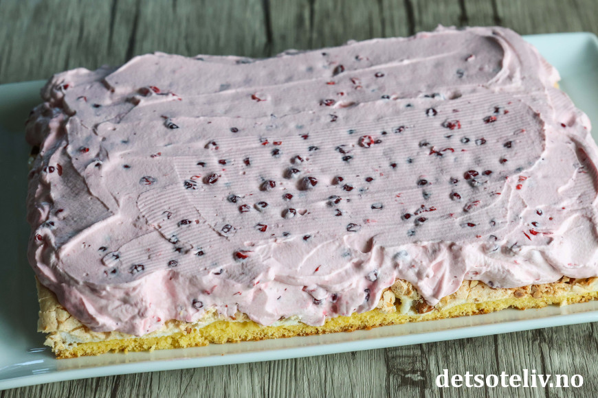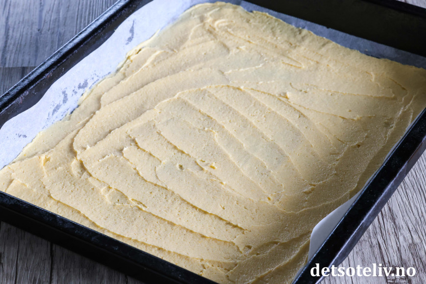 ♥ Merk at det kommer til å bli kun et veldig tynt lag med kakedeig i langpannen. Bruk en smørekniv og gjør deg litt flid med å prøve å få deigen utover i et tynt og jevnt lag. Det er meningen at deiglaget skal være tynt, og kaken kommer til å bli høy nok med to lag, marengs og tyttebærkrem. 😊