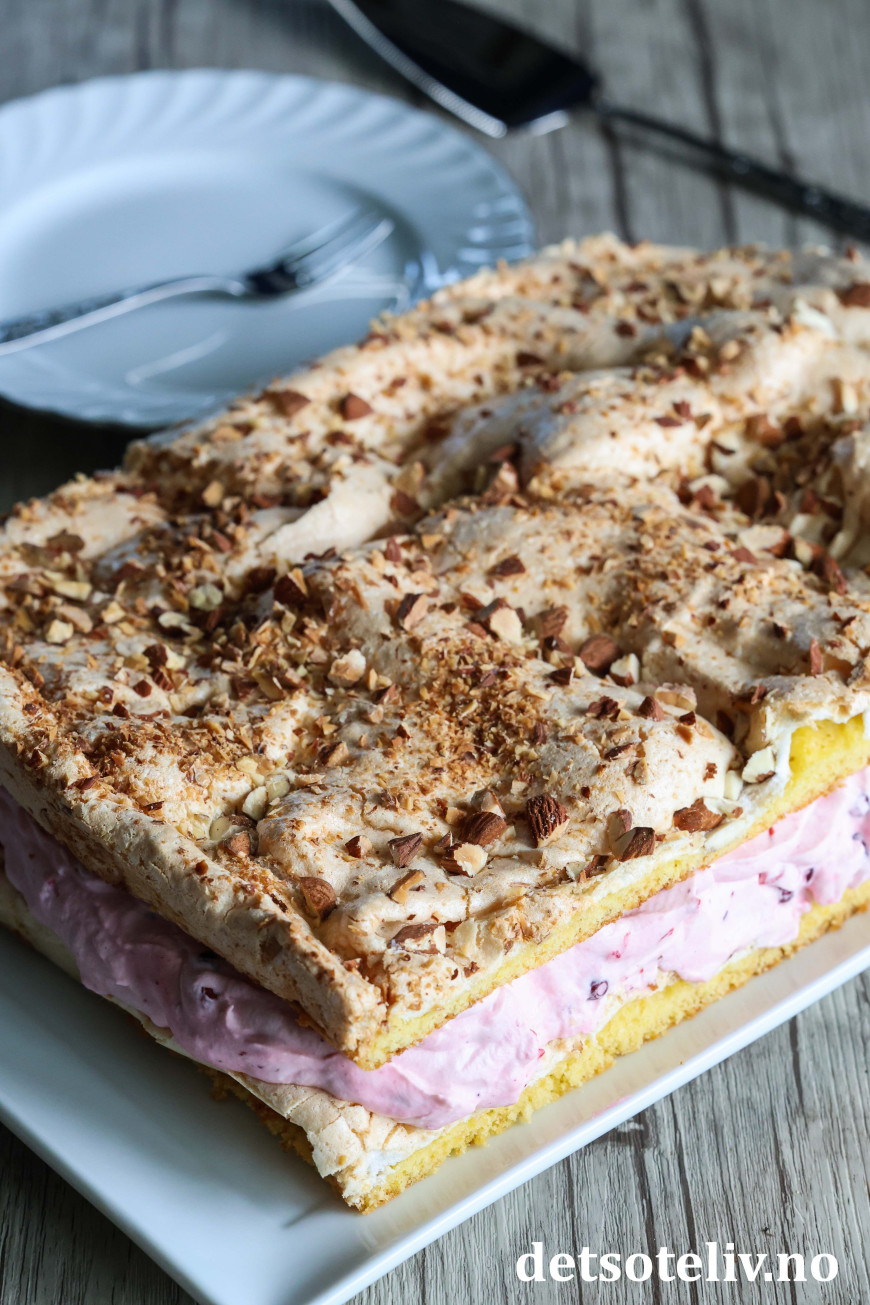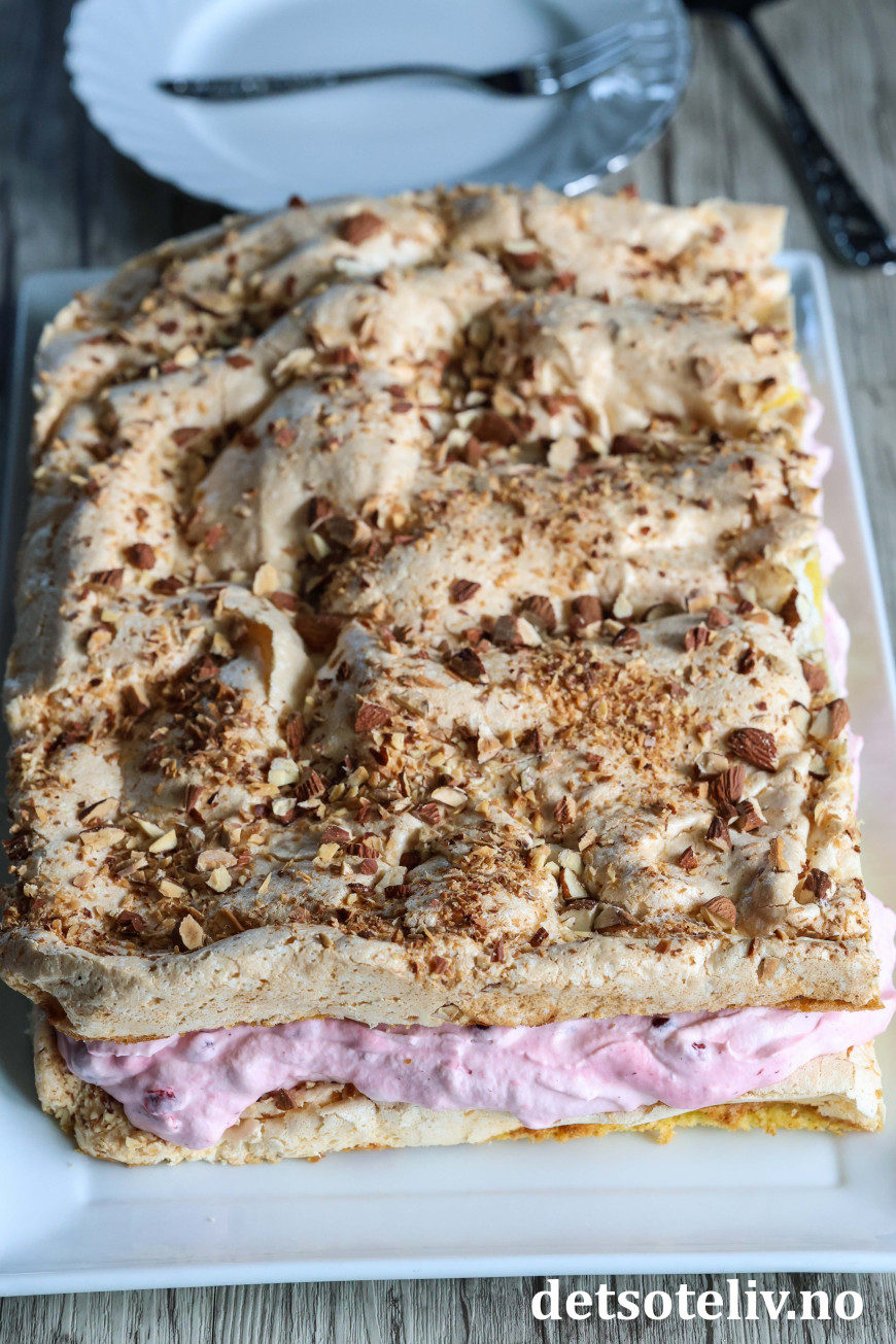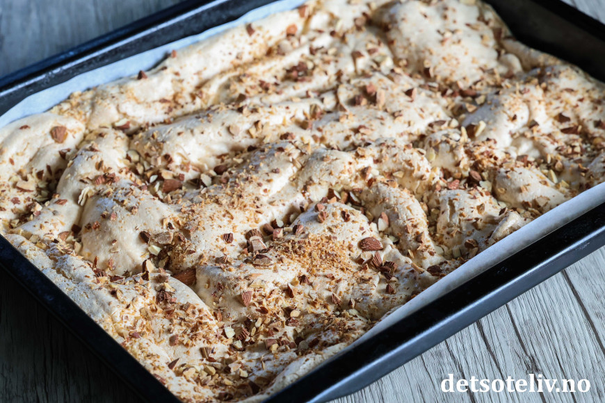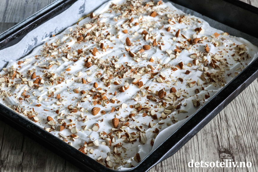 Smør deigen tynt utover i bunnen på en stor, bakepapirkledd langpanne (ca. 30 x 40 cm). Fordel marengsen jevnt over deigen i langpannen. Strø over hakkede mandler.
