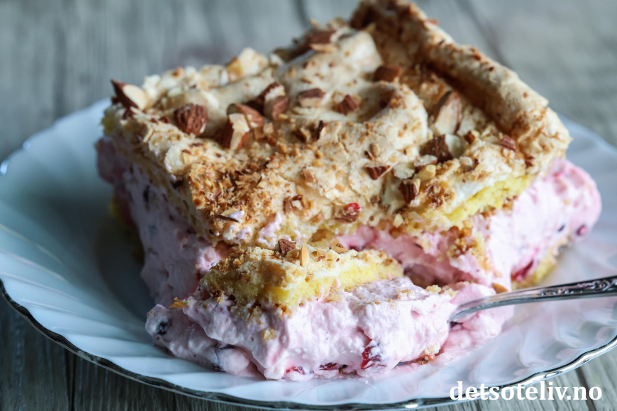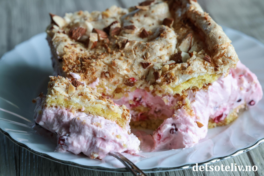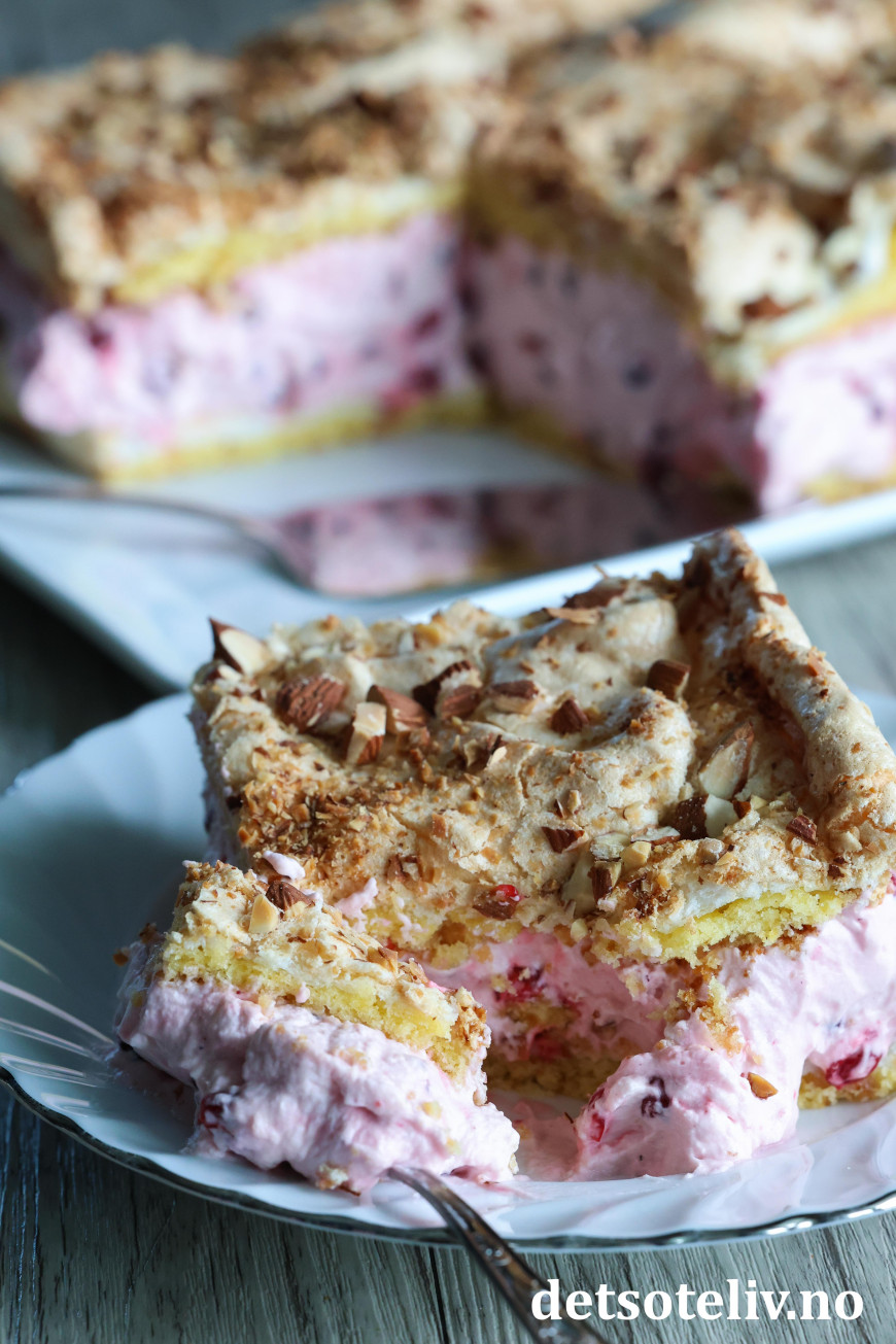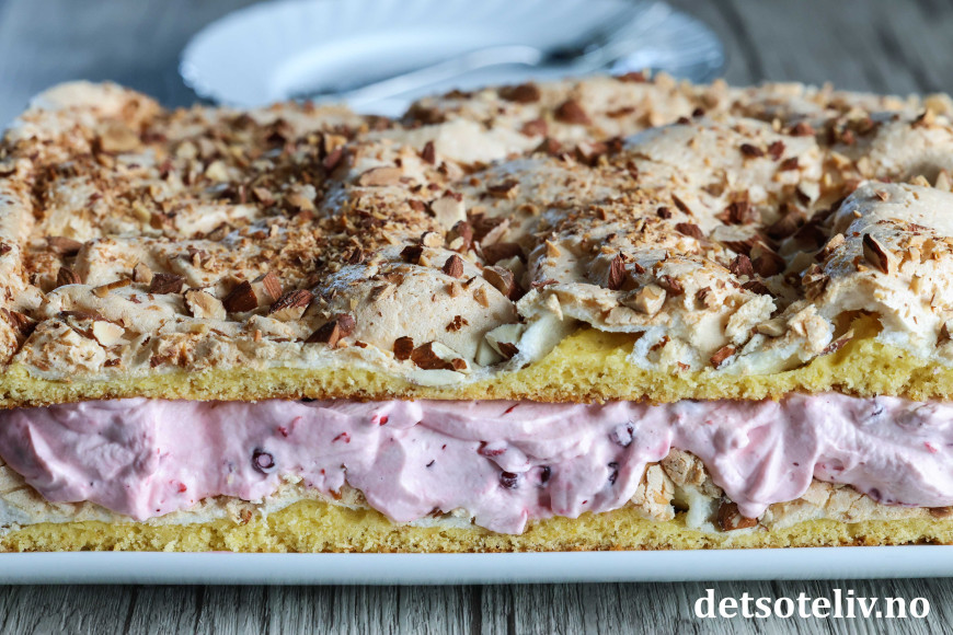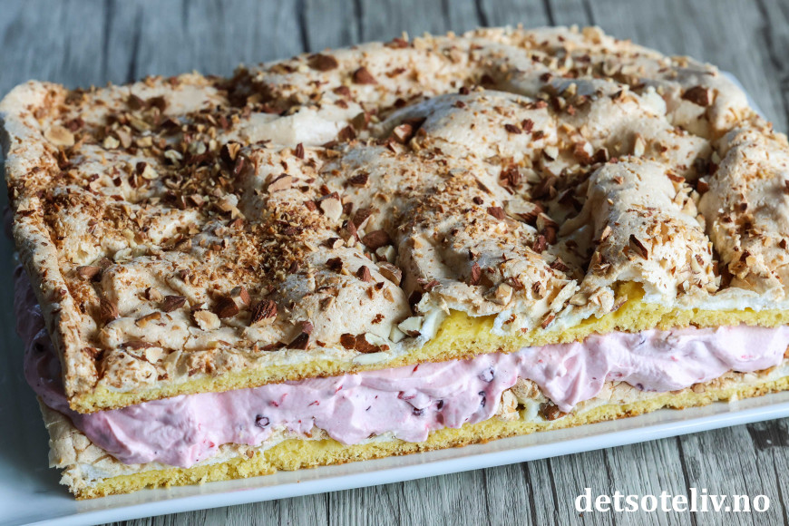 Smør deigen tynt utover i bunnen på en stor, bakepapirkledd langpanne (ca. 30 x 40 cm). Fordel marengsen jevnt over deigen i langpannen. Strø over hakkede mandler.