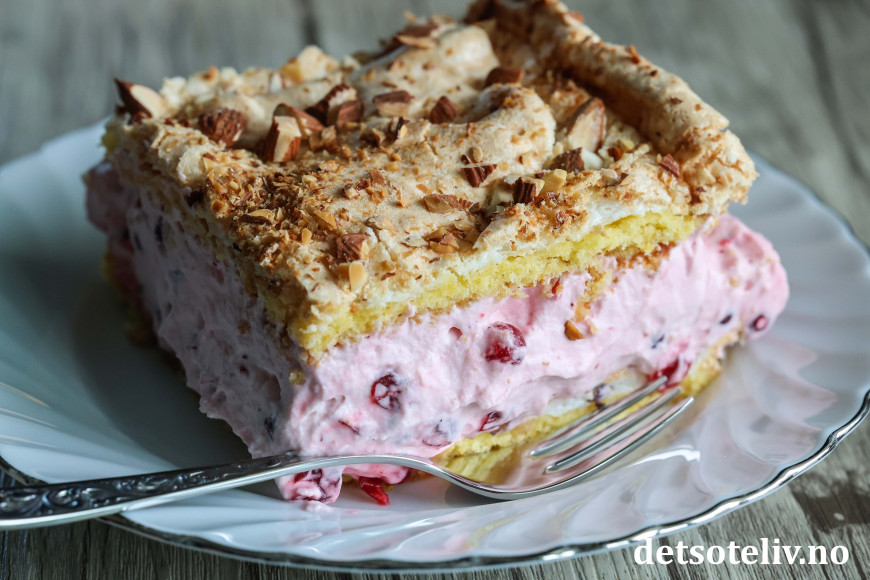 ♥ I kaken på bildet har jeg brukt 2 pakker ferdigrørt tyttebærsyltetøy (fra Nora, kjøpes frossen, 1 pk = 280 g). Det går fint å røre tyttebær selv i stedet (se Rørte tyttebær). Bruk da 400 g tyttebær (friske eller frosne) og ca. 150 g sukker (smak deg til).