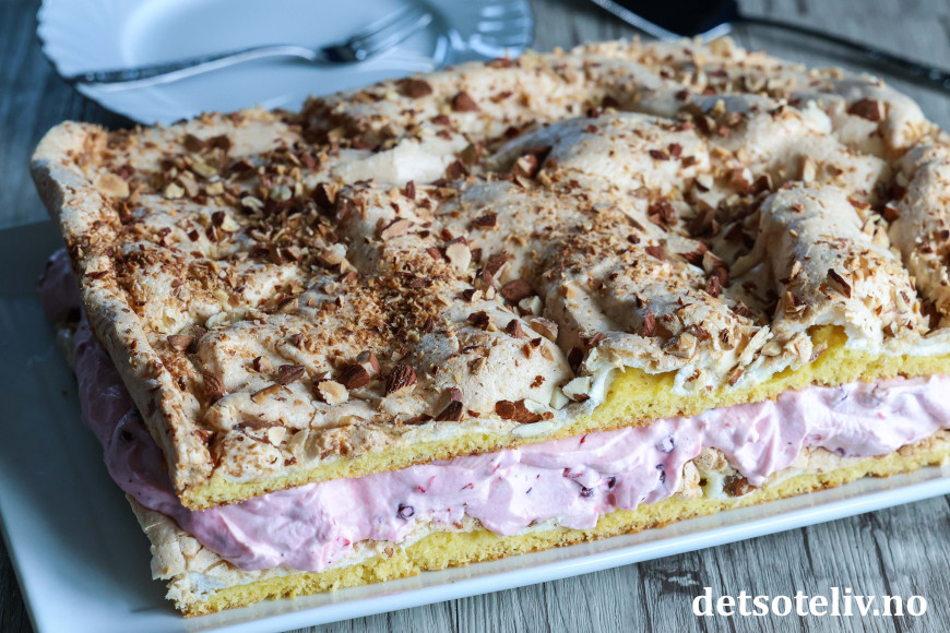 Avkjøl kaken helt i langpannen. Hvelv så ut kaken og fjern bakepapiret. Snu kaken tilbake, slik at marengssiden vender opp. Del kaken i to deler på midten slik at kaken får halv størrelse (ca. 20 x 30 cm).